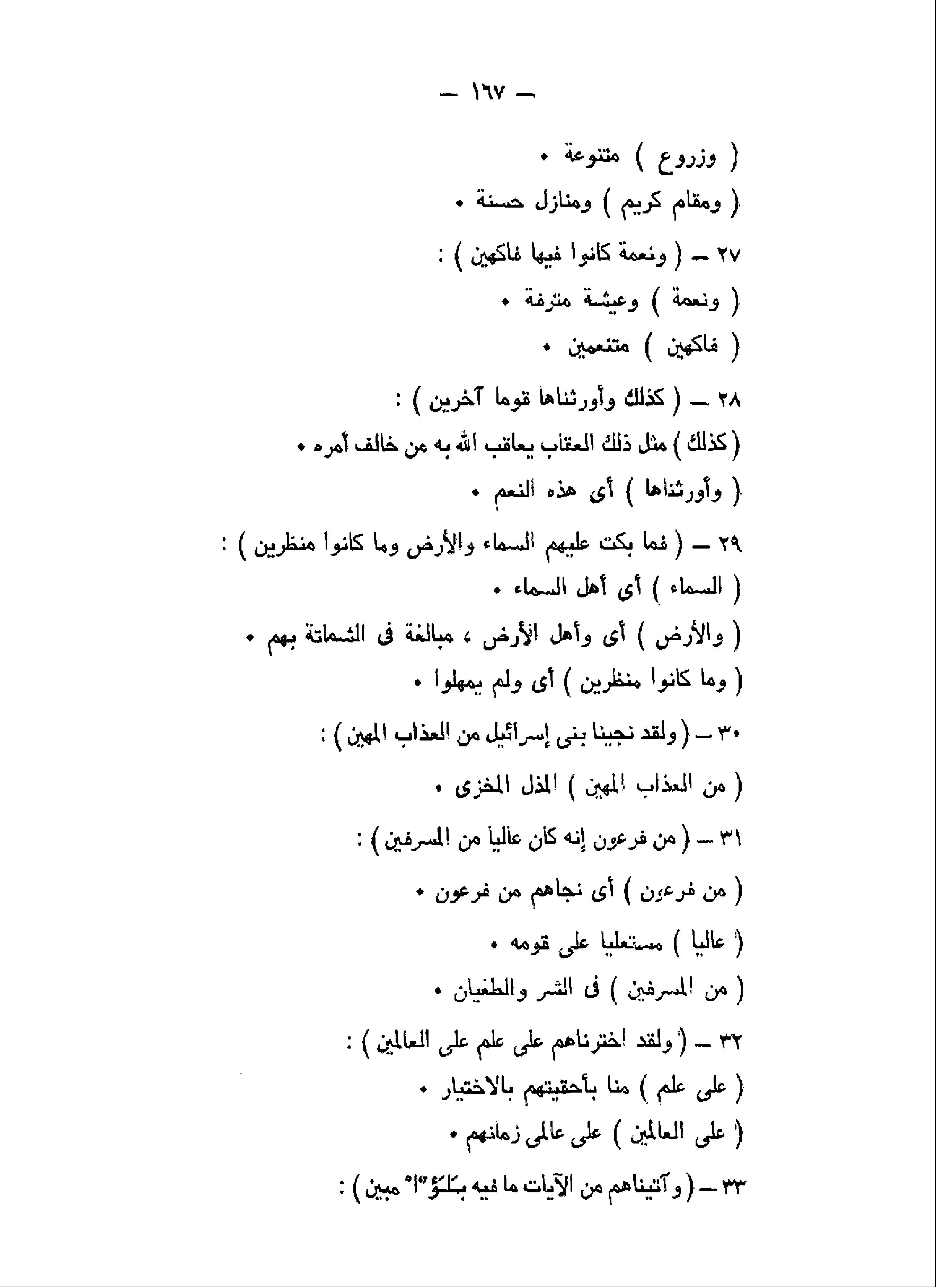 وَنَعْمَةٍ كانُوا فِيها فاكِهِينَ (27) كَذلِكَ وَأَوْرَثْناها قَوْماً آخَرِينَ (28) فَما بَكَتْ عَلَيْهِمُ السَّماءُ وَالْأَرْضُ وَما كانُوا مُنْظَرِينَ (29) وَلَقَدْ نَجَّيْنا بَنِي إِسْرائِيلَ مِنَ الْعَذابِ الْمُهِينِ (30) مِنْ فِرْعَوْنَ إِنَّهُ كانَ عالِياً مِنَ الْمُسْرِفِينَ (31)