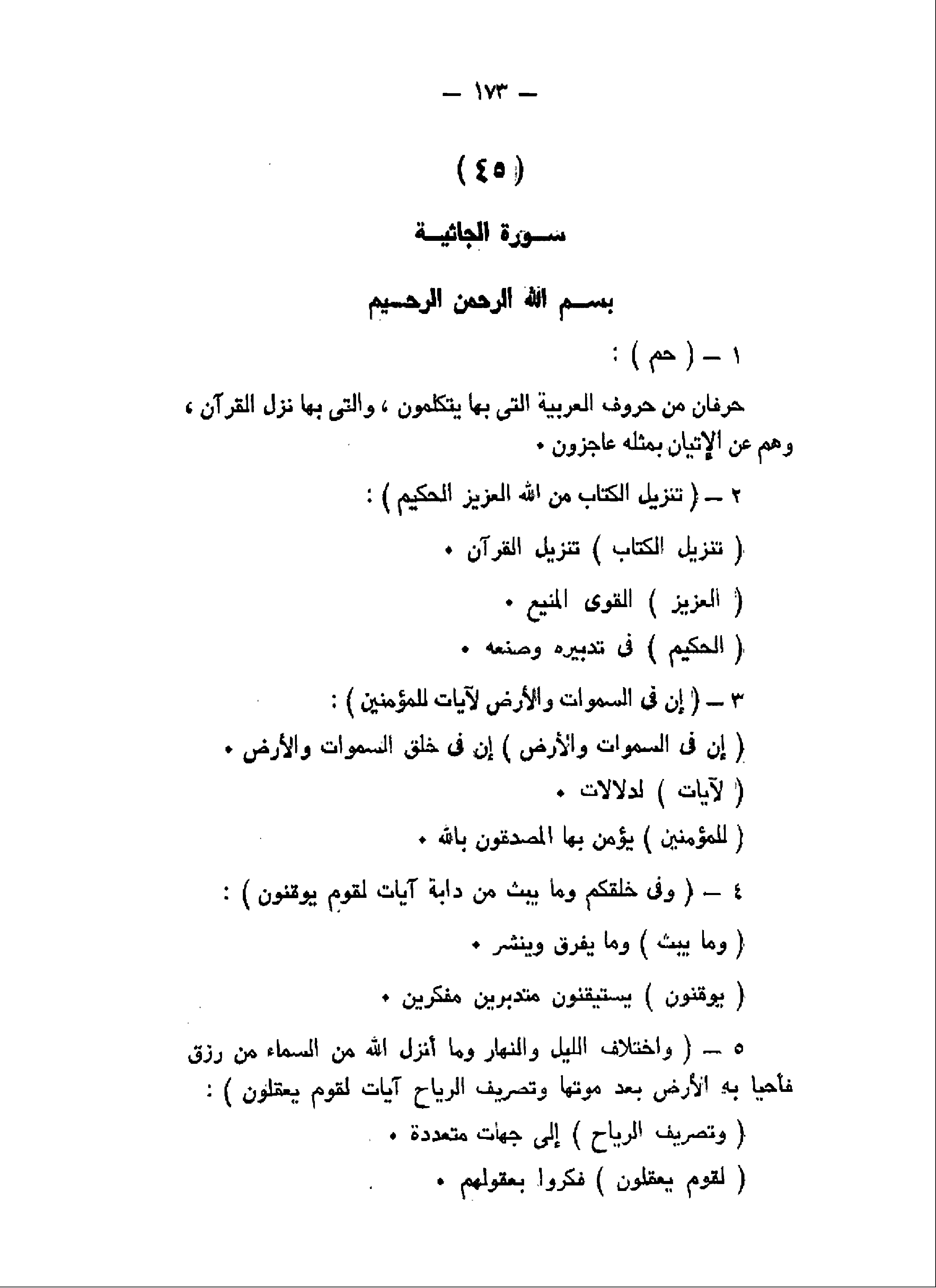حم (1) تَنْزِيلُ الْكِتابِ مِنَ اللَّهِ الْعَزِيزِ الْحَكِيمِ (2) إِنَّ فِي السَّماواتِ وَالْأَرْضِ لَآياتٍ لِلْمُؤْمِنِينَ (3) وَفِي خَلْقِكُمْ وَما يَبُثُّ مِنْ دابَّةٍ آياتٌ لِقَوْمٍ يُوقِنُونَ (4)