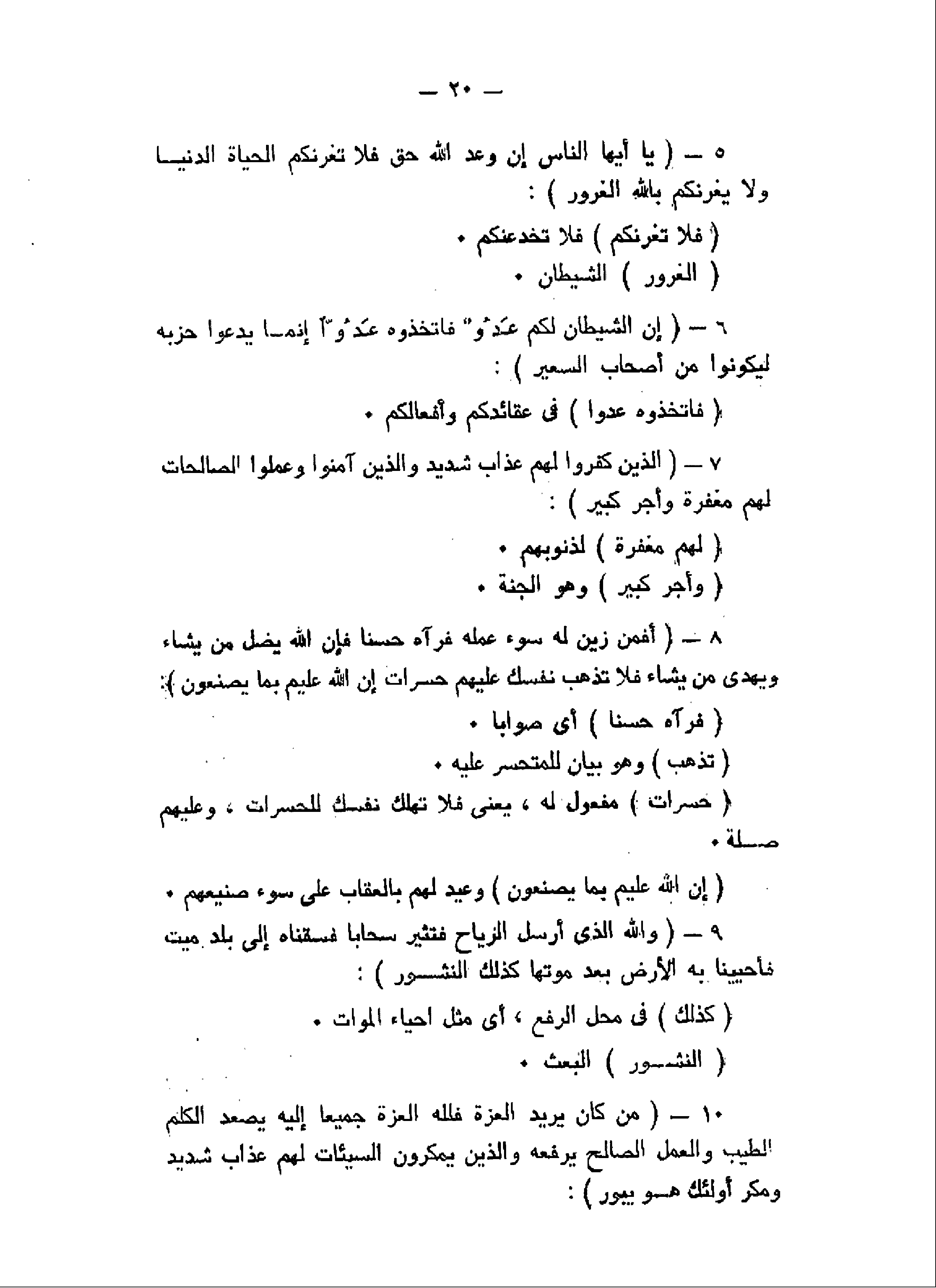 يا أَيُّهَا النَّاسُ إِنَّ وَعْدَ اللَّهِ حَقٌّ فَلا تَغُرَّنَّكُمُ الْحَياةُ الدُّنْيا وَلا يَغُرَّنَّكُمْ بِاللَّهِ الْغَرُورُ (5) إِنَّ الشَّيْطانَ لَكُمْ عَدُوٌّ فَاتَّخِذُوهُ عَدُوًّا إِنَّما يَدْعُوا حِزْبَهُ لِيَكُونُوا مِنْ أَصْحابِ السَّعِيرِ (6) الَّذِينَ كَفَرُوا لَهُمْ عَذابٌ شَدِيدٌ وَالَّذِينَ آمَنُوا وَعَمِلُوا الصَّالِحاتِ لَهُمْ مَغْفِرَةٌ وَأَجْرٌ كَبِيرٌ (7) أَفَمَنْ زُيِّنَ لَهُ سُوءُ عَمَلِهِ فَرَآهُ حَسَناً فَإِنَّ اللَّهَ يُضِلُّ مَنْ يَشاءُ وَيَهْدِي مَنْ يَشاءُ فَلا تَذْهَبْ نَفْسُكَ عَلَيْهِمْ حَسَراتٍ إِنَّ اللَّهَ عَلِيمٌ بِما يَصْنَعُونَ (8) وَاللَّهُ الَّذِي أَرْسَلَ الرِّياحَ فَتُثِيرُ سَحاباً فَسُقْناهُ إِلى بَلَدٍ مَيِّتٍ فَأَحْيَيْنا بِهِ الْأَرْضَ بَعْدَ مَوْتِها كَذلِكَ النُّشُورُ (9)