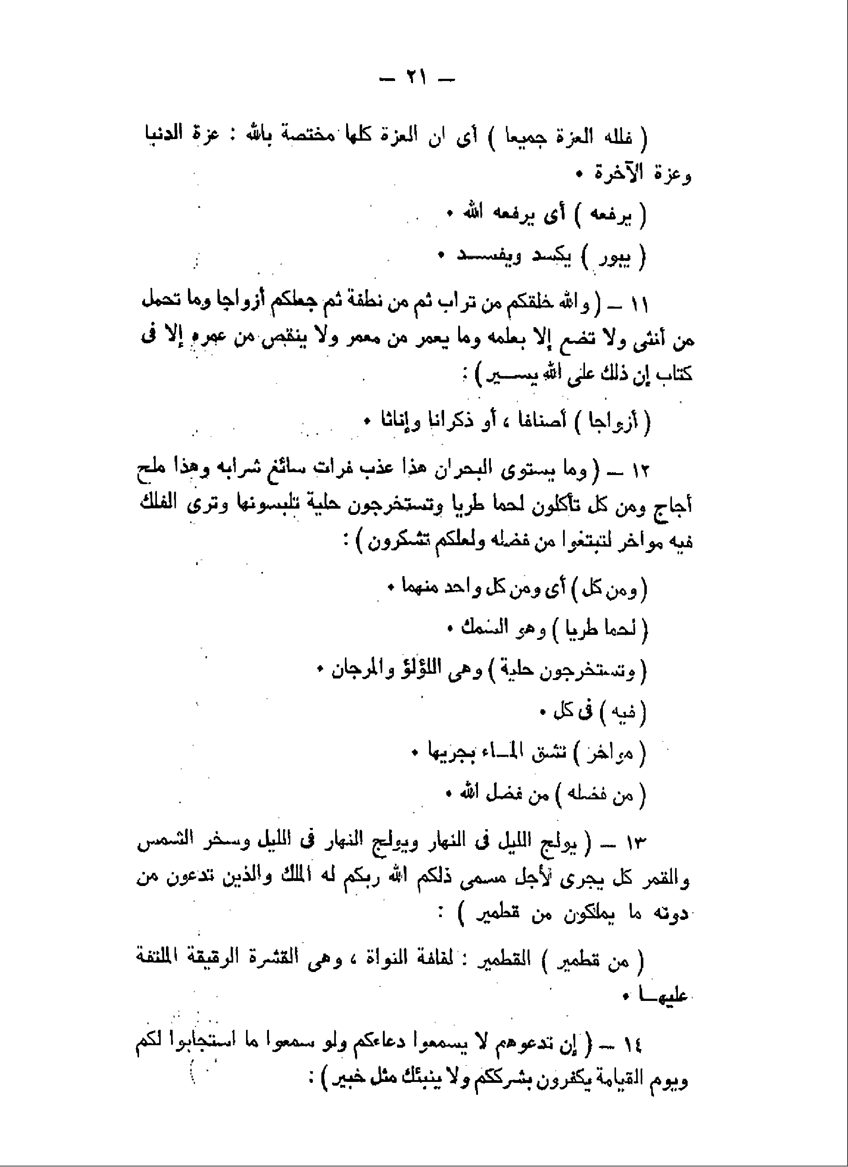 وَاللَّهُ خَلَقَكُمْ مِنْ تُرابٍ ثُمَّ مِنْ نُطْفَةٍ ثُمَّ جَعَلَكُمْ أَزْواجاً وَما تَحْمِلُ مِنْ أُنْثى وَلا تَضَعُ إِلاَّ بِعِلْمِهِ وَما يُعَمَّرُ مِنْ مُعَمَّرٍ وَلا يُنْقَصُ مِنْ عُمُرِهِ إِلاَّ فِي كِتابٍ إِنَّ ذلِكَ عَلَى اللَّهِ يَسِيرٌ (11) وَما يَسْتَوِي الْبَحْرانِ هذا عَذْبٌ فُراتٌ سائِغٌ شَرابُهُ وَهذا مِلْحٌ أُجاجٌ وَمِنْ كُلٍّ تَأْكُلُونَ لَحْماً طَرِيًّا وَتَسْتَخْرِجُونَ حِلْيَةً تَلْبَسُونَها وَتَرَى الْفُلْكَ فِيهِ مَواخِرَ لِتَبْتَغُوا مِنْ فَضْلِهِ وَلَعَلَّكُمْ تَشْكُرُونَ (12) يُولِجُ اللَّيْلَ فِي النَّهارِ وَيُولِجُ النَّهارَ فِي اللَّيْلِ وَسَخَّرَ الشَّمْسَ وَالْقَمَرَ كُلٌّ يَجْرِي لِأَجَلٍ مُسَمًّى ذلِكُمُ اللَّهُ رَبُّكُمْ لَهُ الْمُلْكُ وَالَّذِينَ تَدْعُونَ مِنْ دُونِهِ ما يَمْلِكُونَ مِنْ قِطْمِيرٍ (13) إِنْ تَدْعُوهُمْ لا يَسْمَعُوا دُعاءَكُمْ وَلَوْ سَمِعُوا مَا اسْتَجابُوا لَكُمْ وَيَوْمَ الْقِيامَةِ يَكْفُرُونَ بِشِرْكِكُمْ وَلا يُنَبِّئُكَ مِثْلُ خَبِيرٍ (14)