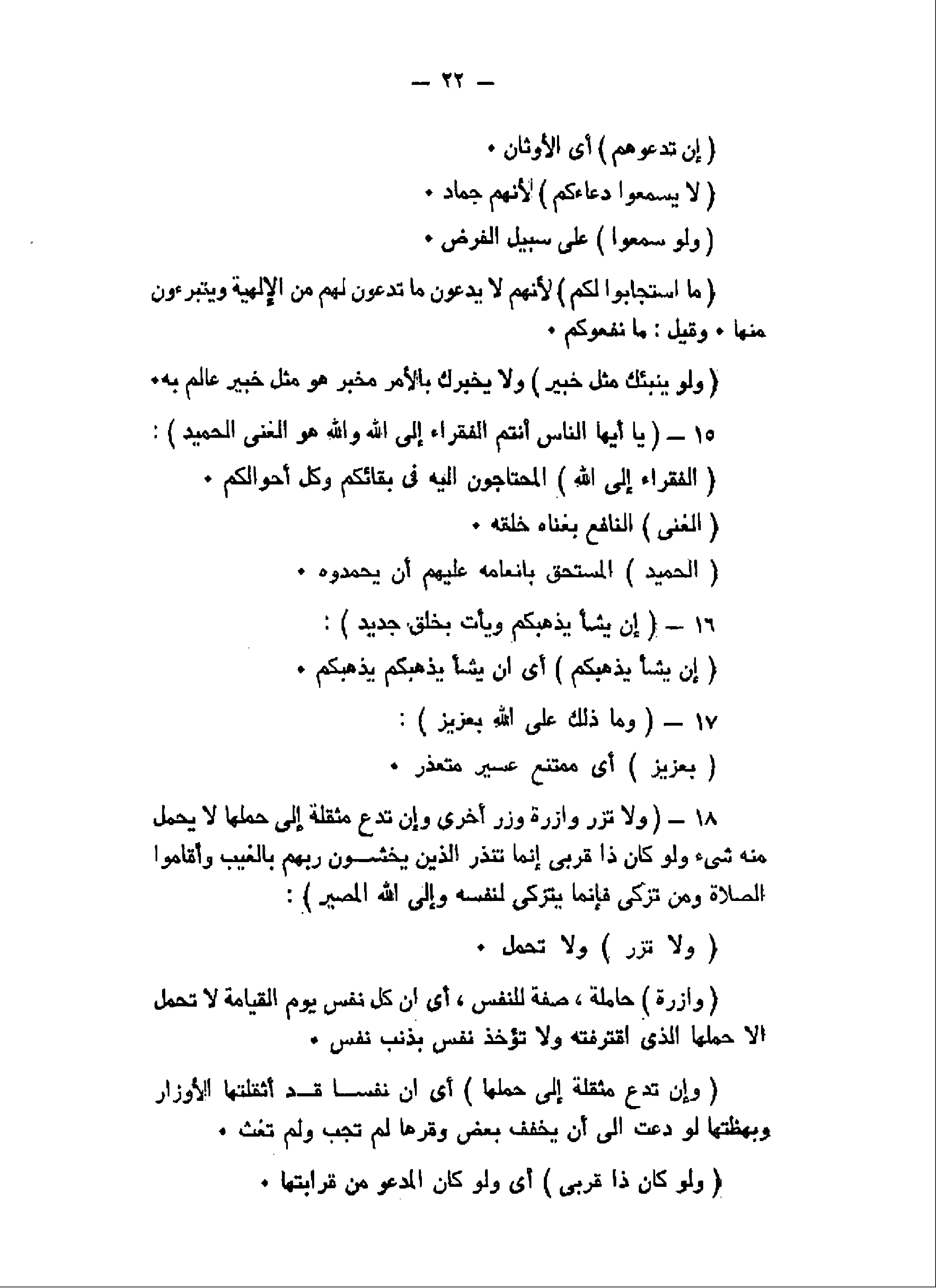 يا أَيُّهَا النَّاسُ أَنْتُمُ الْفُقَراءُ إِلَى اللَّهِ وَاللَّهُ هُوَ الْغَنِيُّ الْحَمِيدُ (15) إِنْ يَشَأْ يُذْهِبْكُمْ وَيَأْتِ بِخَلْقٍ جَدِيدٍ (16) وَما ذلِكَ عَلَى اللَّهِ بِعَزِيزٍ (17) وَلا تَزِرُ وازِرَةٌ وِزْرَ أُخْرى وَإِنْ تَدْعُ مُثْقَلَةٌ إِلى حِمْلِها لا يُحْمَلْ مِنْهُ شَيْءٌ وَلَوْ كانَ ذا قُرْبى إِنَّما تُنْذِرُ الَّذِينَ يَخْشَوْنَ رَبَّهُمْ بِالْغَيْبِ وَأَقامُوا الصَّلاةَ وَمَنْ تَزَكَّى فَإِنَّما يَتَزَكَّى لِنَفْسِهِ وَإِلَى اللَّهِ الْمَصِيرُ (18)