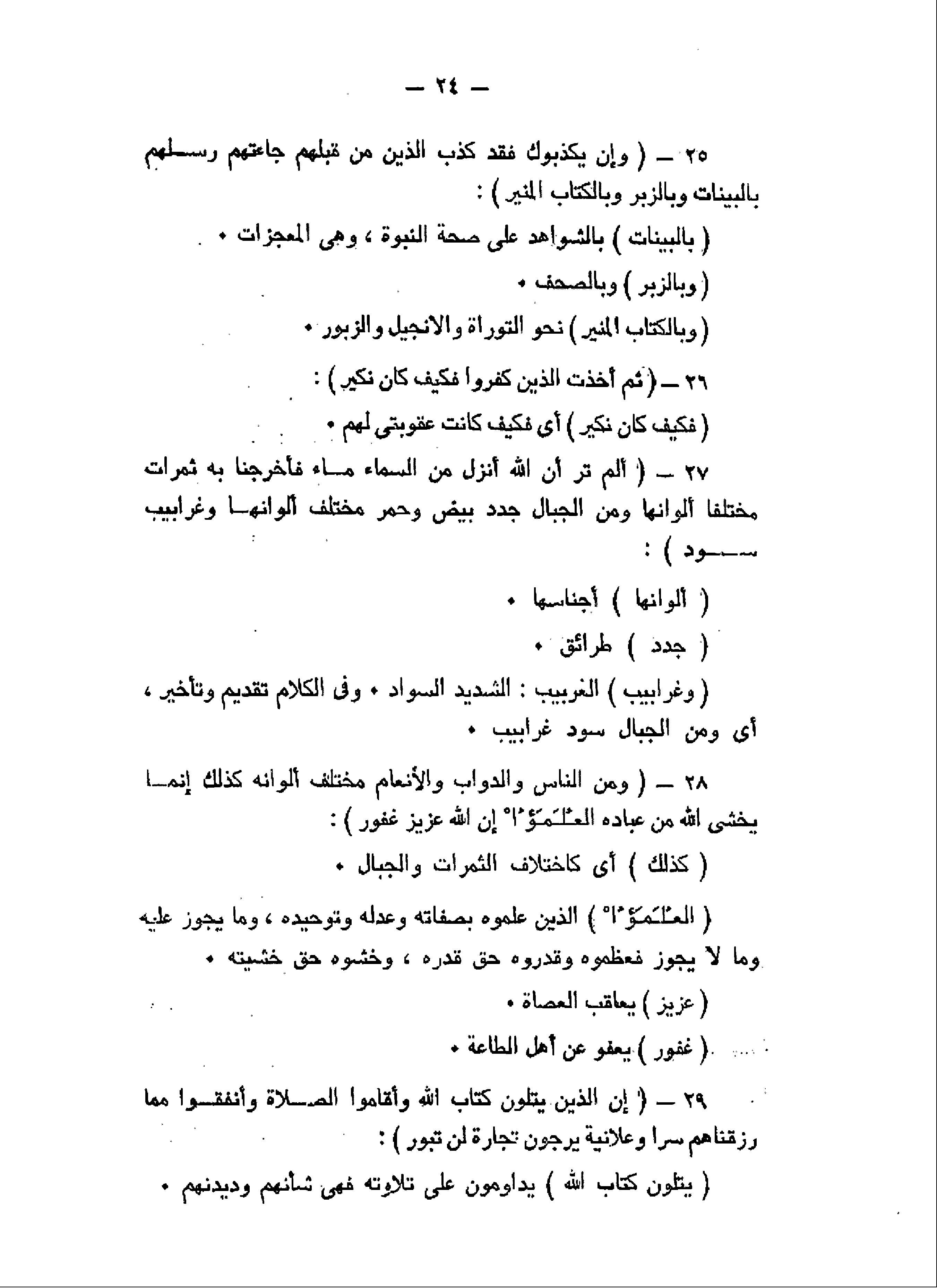 وَإِنْ يُكَذِّبُوكَ فَقَدْ كَذَّبَ الَّذِينَ مِنْ قَبْلِهِمْ جاءَتْهُمْ رُسُلُهُمْ بِالْبَيِّناتِ وَبِالزُّبُرِ وَبِالْكِتابِ الْمُنِيرِ (25) ثُمَّ أَخَذْتُ الَّذِينَ كَفَرُوا فَكَيْفَ كانَ نَكِيرِ (26) أَلَمْ تَرَ أَنَّ اللَّهَ أَنْزَلَ مِنَ السَّماءِ ماءً فَأَخْرَجْنا بِهِ ثَمَراتٍ مُخْتَلِفاً أَلْوانُها وَمِنَ الْجِبالِ جُدَدٌ بِيضٌ وَحُمْرٌ مُخْتَلِفٌ أَلْوانُها وَغَرابِيبُ سُودٌ (27) وَمِنَ النَّاسِ وَالدَّوَابِّ وَالْأَنْعامِ مُخْتَلِفٌ أَلْوانُهُ كَذلِكَ إِنَّما يَخْشَى اللَّهَ مِنْ عِبادِهِ الْعُلَماءُ إِنَّ اللَّهَ عَزِيزٌ غَفُورٌ (28) إِنَّ الَّذِينَ يَتْلُونَ كِتابَ اللَّهِ وَأَقامُوا الصَّلاةَ وَأَنْفَقُوا مِمَّا رَزَقْناهُمْ سِرًّا وَعَلانِيَةً يَرْجُونَ تِجارَةً لَنْ تَبُورَ (29)
