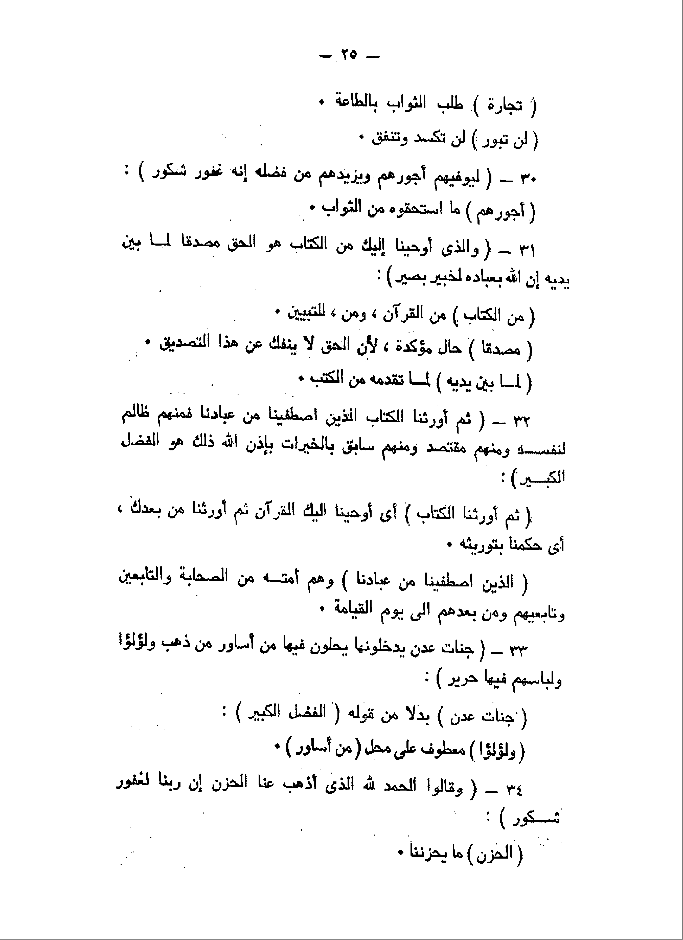 لِيُوَفِّيَهُمْ أُجُورَهُمْ وَيَزِيدَهُمْ مِنْ فَضْلِهِ إِنَّهُ غَفُورٌ شَكُورٌ (30) وَالَّذِي أَوْحَيْنا إِلَيْكَ مِنَ الْكِتابِ هُوَ الْحَقُّ مُصَدِّقاً لِما بَيْنَ يَدَيْهِ إِنَّ اللَّهَ بِعِبادِهِ لَخَبِيرٌ بَصِيرٌ (31) ثُمَّ أَوْرَثْنَا الْكِتابَ الَّذِينَ اصْطَفَيْنا مِنْ عِبادِنا فَمِنْهُمْ ظالِمٌ لِنَفْسِهِ وَمِنْهُمْ مُقْتَصِدٌ وَمِنْهُمْ سابِقٌ بِالْخَيْراتِ بِإِذْنِ اللَّهِ ذلِكَ هُوَ الْفَضْلُ الْكَبِيرُ (32) جَنَّاتُ عَدْنٍ يَدْخُلُونَها يُحَلَّوْنَ فِيها مِنْ أَساوِرَ مِنْ ذَهَبٍ وَلُؤْلُؤاً وَلِباسُهُمْ فِيها حَرِيرٌ (33) وَقالُوا الْحَمْدُ لِلَّهِ الَّذِي أَذْهَبَ عَنَّا الْحَزَنَ إِنَّ رَبَّنا لَغَفُورٌ شَكُورٌ (34)