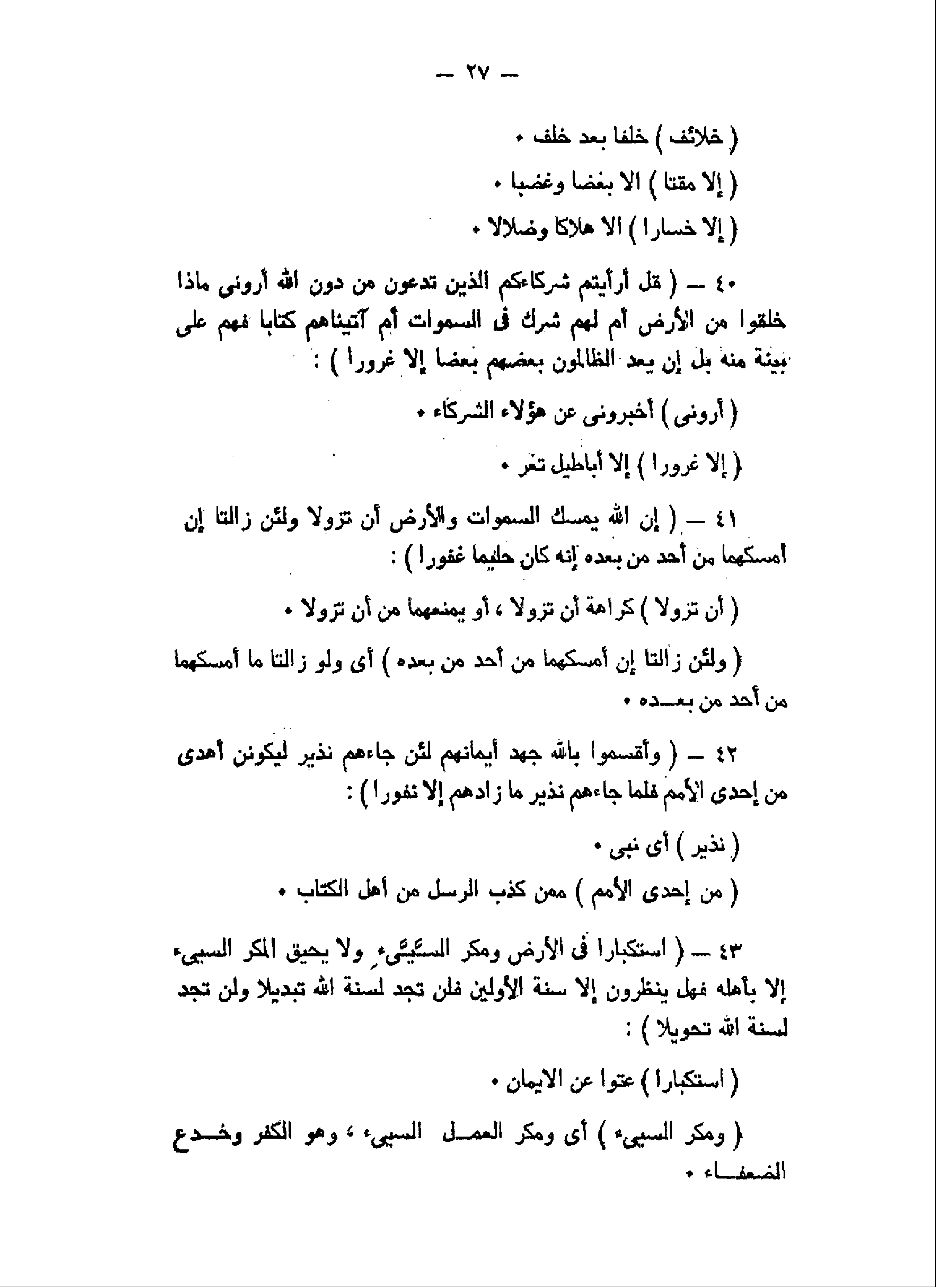 قُلْ أَرَأَيْتُمْ شُرَكاءَكُمُ الَّذِينَ تَدْعُونَ مِنْ دُونِ اللَّهِ أَرُونِي ماذا خَلَقُوا مِنَ الْأَرْضِ أَمْ لَهُمْ شِرْكٌ فِي السَّماواتِ أَمْ آتَيْناهُمْ كِتاباً فَهُمْ عَلى بَيِّنَةٍ مِنْهُ بَلْ إِنْ يَعِدُ الظَّالِمُونَ بَعْضُهُمْ بَعْضاً إِلاَّ غُرُوراً (40) إِنَّ اللَّهَ يُمْسِكُ السَّماواتِ وَالْأَرْضَ أَنْ تَزُولا وَلَئِنْ زالَتا إِنْ أَمْسَكَهُما مِنْ أَحَدٍ مِنْ بَعْدِهِ إِنَّهُ كانَ حَلِيماً غَفُوراً (41) وَأَقْسَمُوا بِاللَّهِ جَهْدَ أَيْمانِهِمْ لَئِنْ جاءَهُمْ نَذِيرٌ لَيَكُونُنَّ أَهْدى مِنْ إِحْدَى الْأُمَمِ فَلَمَّا جاءَهُمْ نَذِيرٌ ما زادَهُمْ إِلاَّ نُفُوراً (42) اسْتِكْباراً فِي الْأَرْضِ وَمَكْرَ السَّيِّئِ وَلا يَحِيقُ الْمَكْرُ السَّيِّئُ إِلاَّ بِأَهْلِهِ فَهَلْ يَنْظُرُونَ إِلاَّ سُنَّتَ الْأَوَّلِينَ فَلَنْ تَجِدَ لِسُنَّتِ اللَّهِ تَبْدِيلاً وَلَنْ تَجِدَ لِسُنَّتِ اللَّهِ تَحْوِيلاً (43)