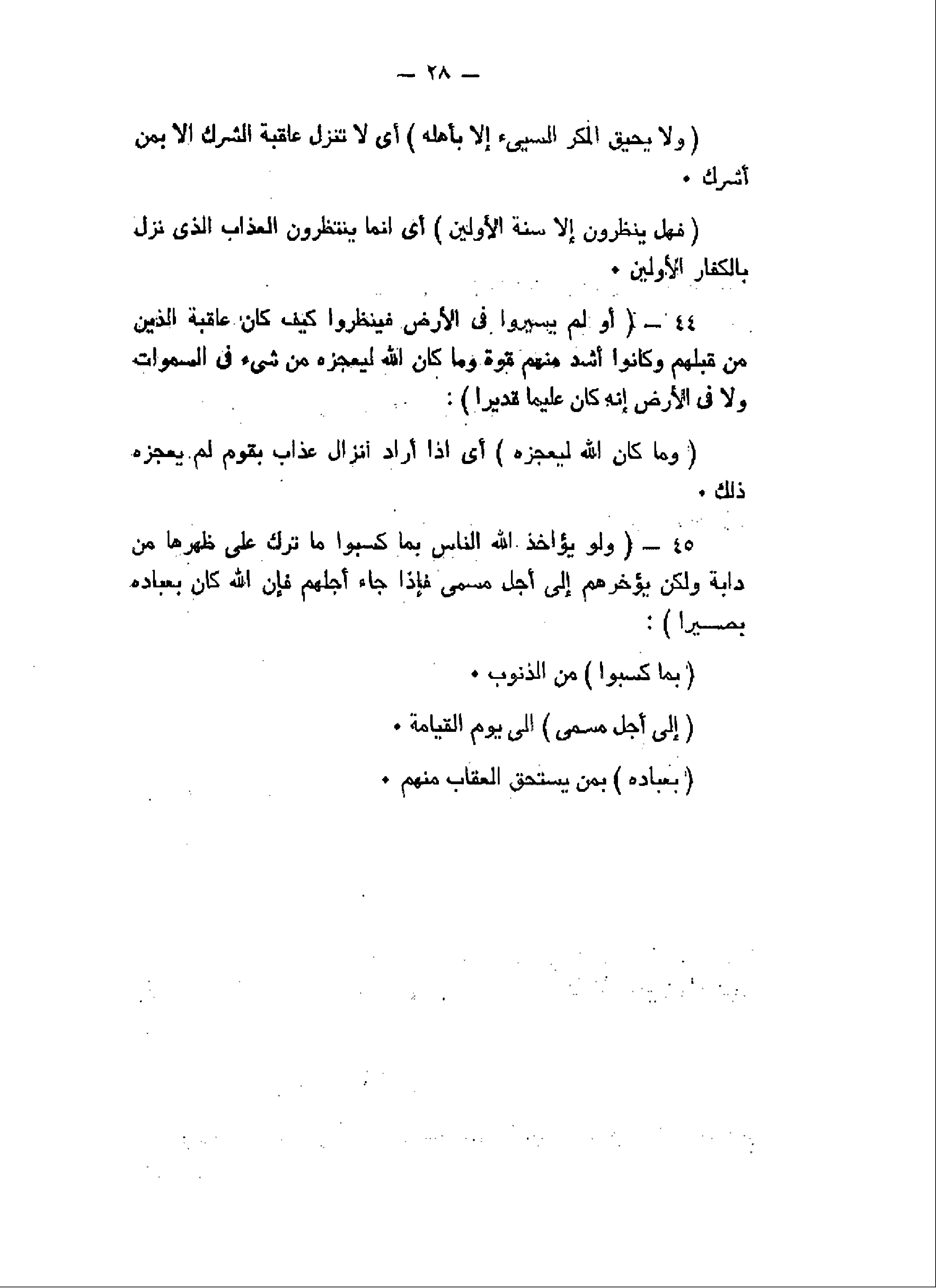 أَوَلَمْ يَسِيرُوا فِي الْأَرْضِ فَيَنْظُرُوا كَيْفَ كانَ عاقِبَةُ الَّذِينَ مِنْ قَبْلِهِمْ وَكانُوا أَشَدَّ مِنْهُمْ قُوَّةً وَما كانَ اللَّهُ لِيُعْجِزَهُ مِنْ شَيْءٍ فِي السَّماواتِ وَلا فِي الْأَرْضِ إِنَّهُ كانَ عَلِيماً قَدِيراً (44) وَلَوْ يُؤاخِذُ اللَّهُ النَّاسَ بِما كَسَبُوا ما تَرَكَ عَلى ظَهْرِها مِنْ دَابَّةٍ وَلكِنْ يُؤَخِّرُهُمْ إِلى أَجَلٍ مُسَمًّى فَإِذا جاءَ أَجَلُهُمْ فَإِنَّ اللَّهَ كانَ بِعِبادِهِ بَصِيراً (45)