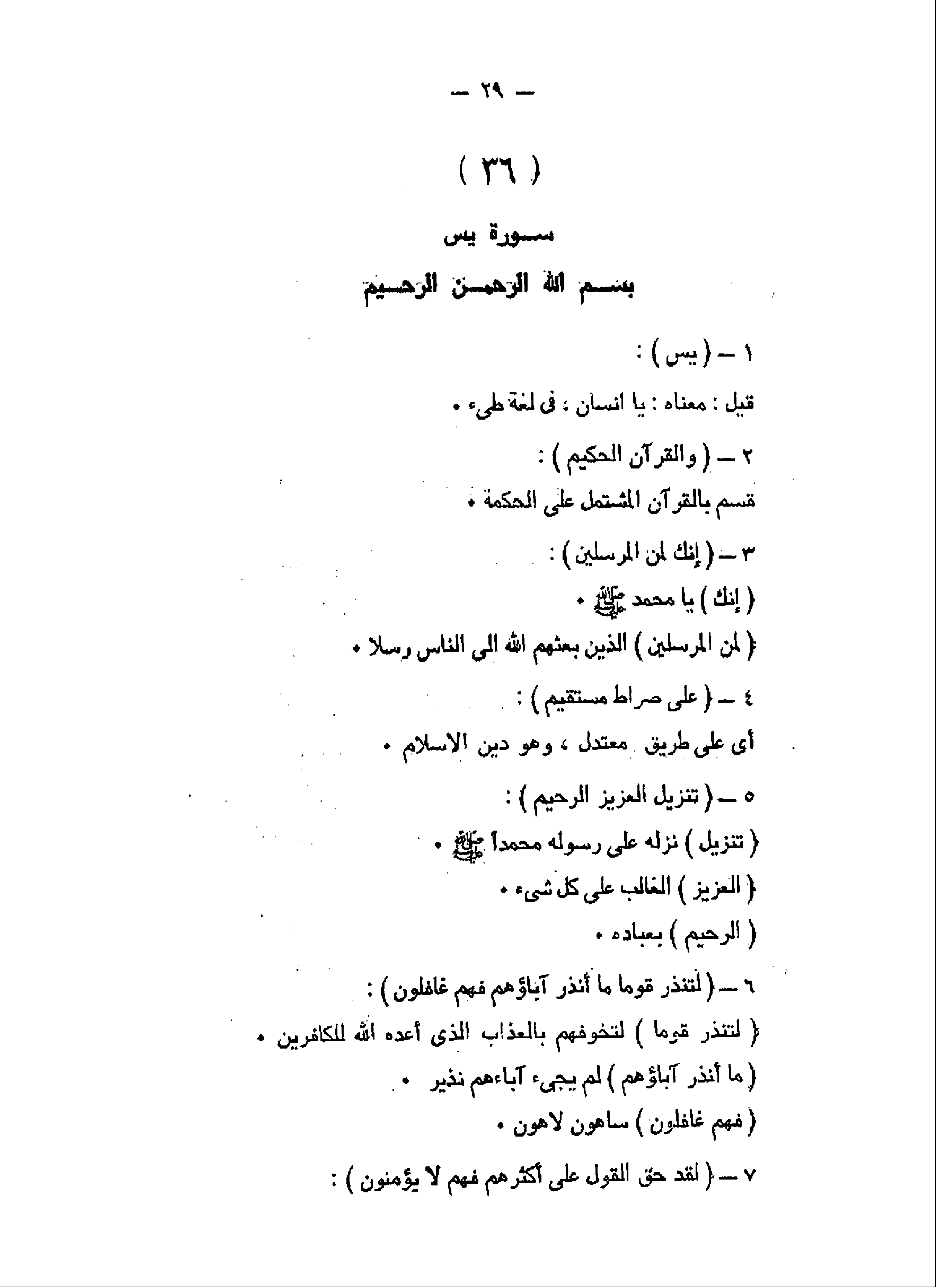 تَنْزِيلَ الْعَزِيزِ الرَّحِيمِ (5) لِتُنْذِرَ قَوْماً ما أُنْذِرَ آباؤُهُمْ فَهُمْ غافِلُونَ (6) لَقَدْ حَقَّ الْقَوْلُ عَلى أَكْثَرِهِمْ فَهُمْ لا يُؤْمِنُونَ (7)