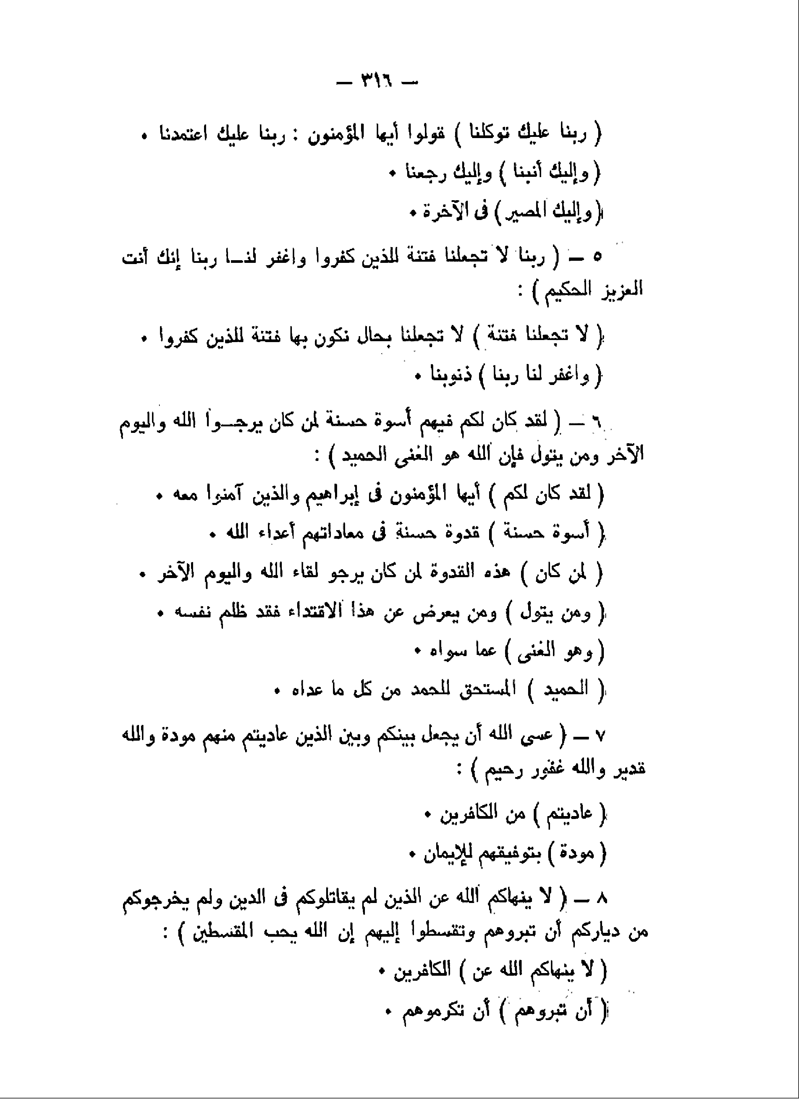 رَبَّنا لا تَجْعَلْنا فِتْنَةً لِلَّذِينَ كَفَرُوا وَاغْفِرْ لَنا رَبَّنا إِنَّكَ أَنْتَ الْعَزِيزُ الْحَكِيمُ (5) لَقَدْ كانَ لَكُمْ فِيهِمْ أُسْوَةٌ حَسَنَةٌ لِمَنْ كانَ يَرْجُوا اللَّهَ وَالْيَوْمَ الْآخِرَ وَمَنْ يَتَوَلَّ فَإِنَّ اللَّهَ هُوَ الْغَنِيُّ الْحَمِيدُ (6) عَسَى اللَّهُ أَنْ يَجْعَلَ بَيْنَكُمْ وَبَيْنَ الَّذِينَ عادَيْتُمْ مِنْهُمْ مَوَدَّةً وَاللَّهُ قَدِيرٌ وَاللَّهُ غَفُورٌ رَحِيمٌ (7) لا يَنْهاكُمُ اللَّهُ عَنِ الَّذِينَ لَمْ يُقاتِلُوكُمْ فِي الدِّينِ وَلَمْ يُخْرِجُوكُمْ مِنْ دِيارِكُمْ أَنْ تَبَرُّوهُمْ وَتُقْسِطُوا إِلَيْهِمْ إِنَّ اللَّهَ يُحِبُّ الْمُقْسِطِينَ (8)