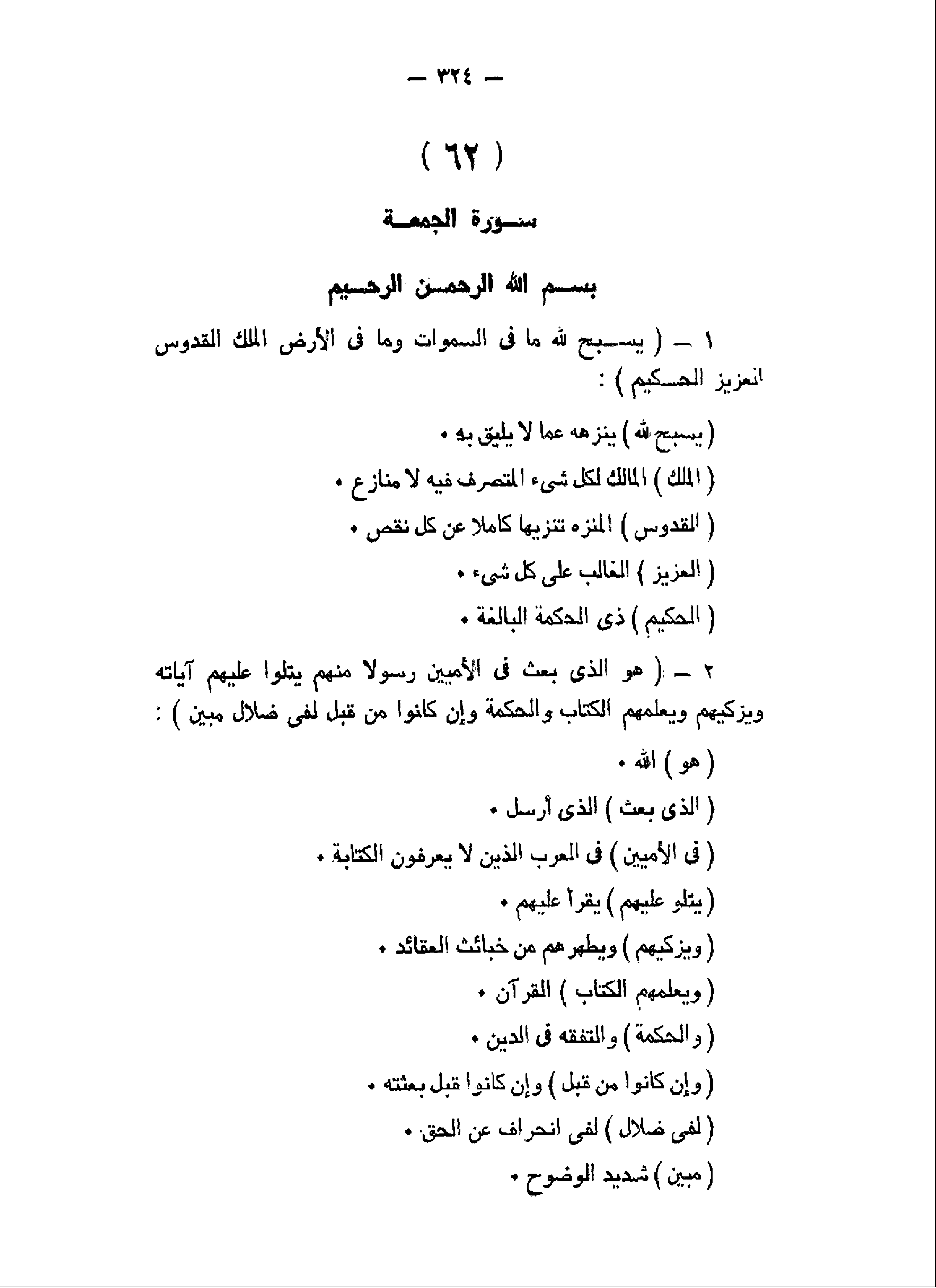 يُسَبِّحُ لِلَّهِ ما فِي السَّماواتِ وَما فِي الْأَرْضِ الْمَلِكِ الْقُدُّوسِ الْعَزِيزِ الْحَكِيمِ (1) هُوَ الَّذِي بَعَثَ فِي الْأُمِّيِّينَ رَسُولاً مِنْهُمْ يَتْلُوا عَلَيْهِمْ آياتِهِ وَيُزَكِّيهِمْ وَيُعَلِّمُهُمُ الْكِتابَ وَالْحِكْمَةَ وَإِنْ كانُوا مِنْ قَبْلُ لَفِي ضَلالٍ مُبِينٍ (2)