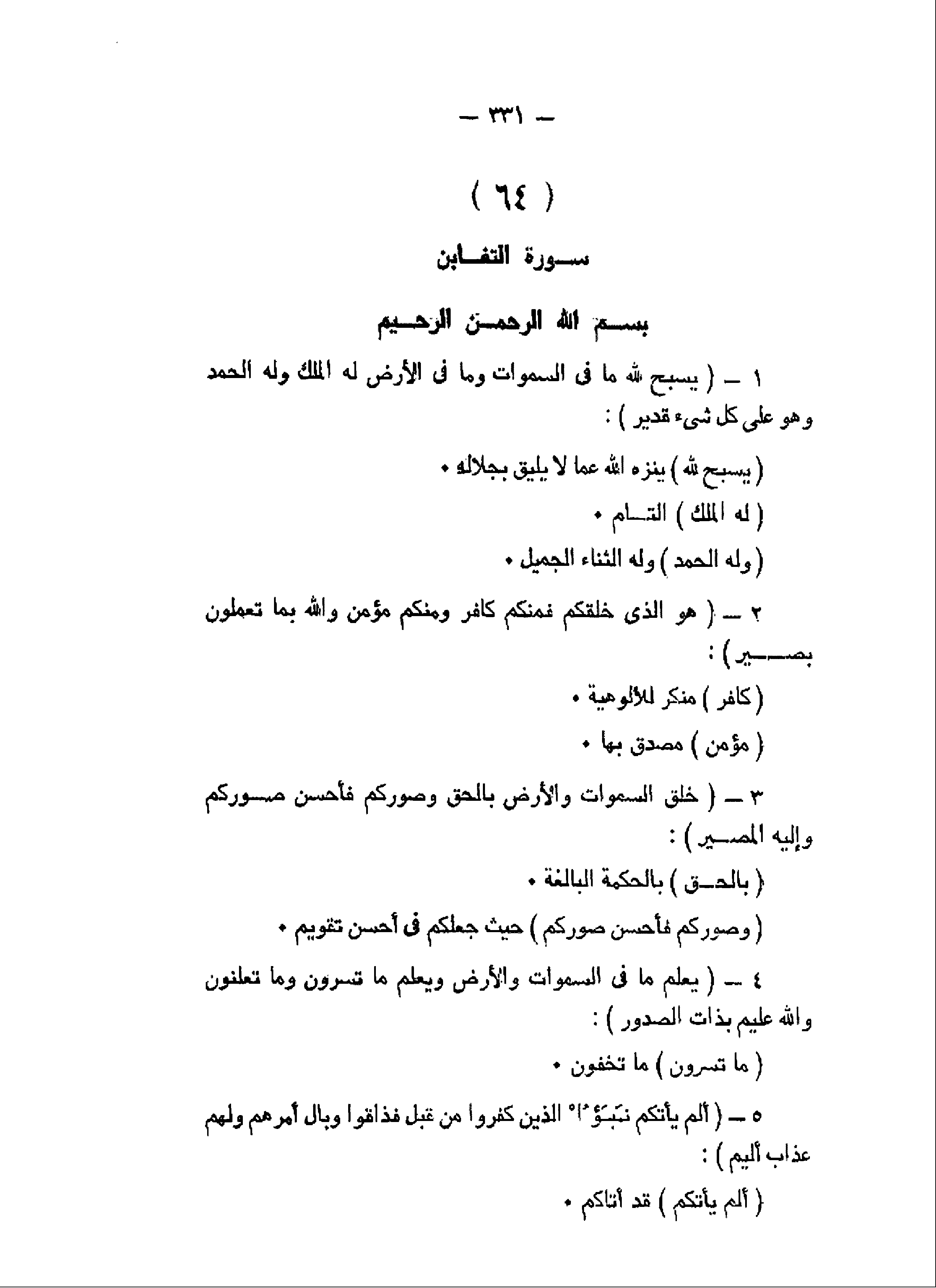 يُسَبِّحُ لِلَّهِ ما فِي السَّماواتِ وَما فِي الْأَرْضِ لَهُ الْمُلْكُ وَلَهُ الْحَمْدُ وَهُوَ عَلى كُلِّ شَيْءٍ قَدِيرٌ (1) هُوَ الَّذِي خَلَقَكُمْ فَمِنْكُمْ كافِرٌ وَمِنْكُمْ مُؤْمِنٌ وَاللَّهُ بِما تَعْمَلُونَ بَصِيرٌ (2) خَلَقَ السَّماواتِ وَالْأَرْضَ بِالْحَقِّ وَصَوَّرَكُمْ فَأَحْسَنَ صُوَرَكُمْ وَإِلَيْهِ الْمَصِيرُ (3) يَعْلَمُ ما فِي السَّماواتِ وَالْأَرْضِ وَيَعْلَمُ ما تُسِرُّونَ وَما تُعْلِنُونَ وَاللَّهُ عَلِيمٌ بِذاتِ الصُّدُورِ (4)