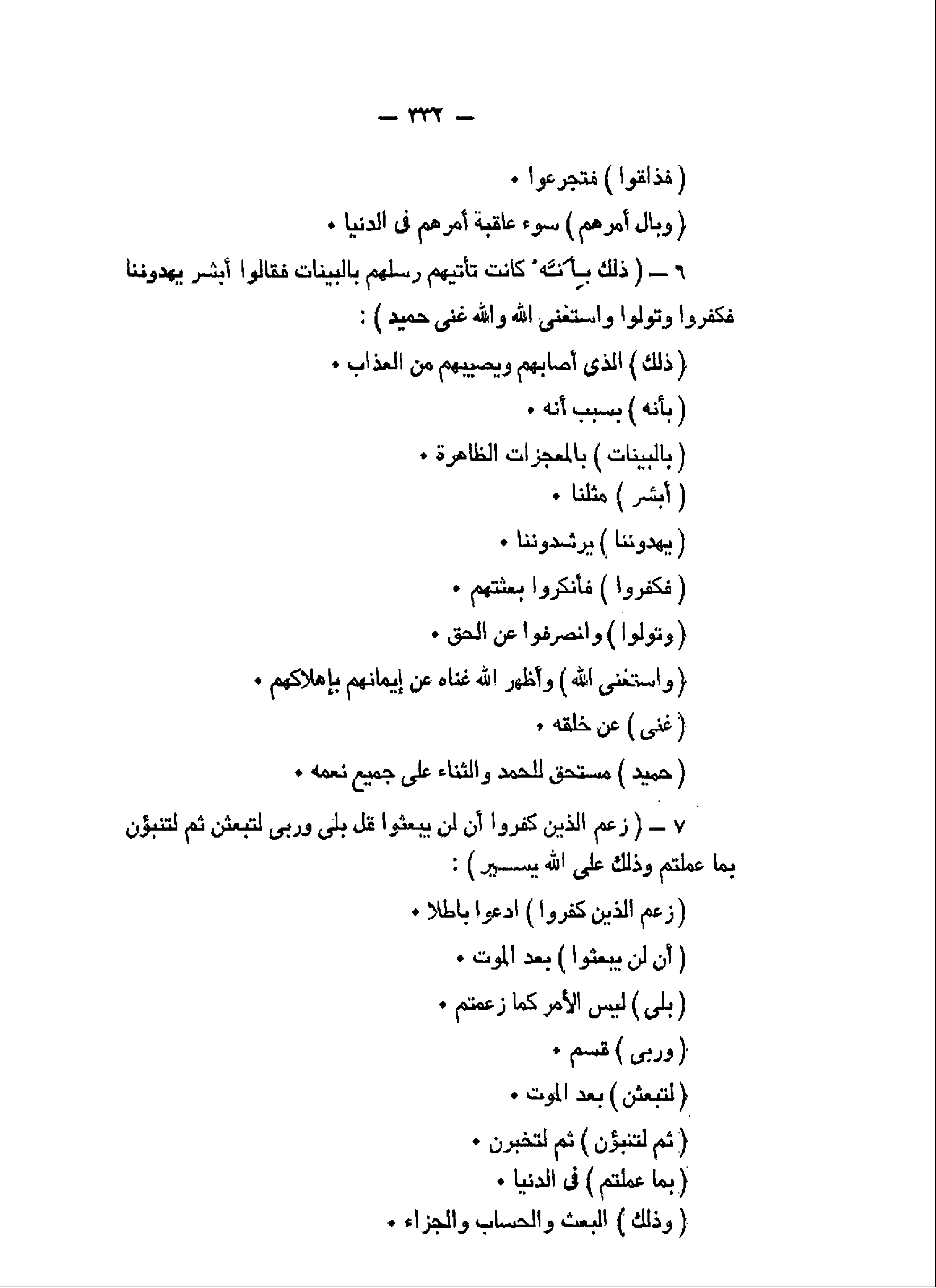 ذلِكَ بِأَنَّهُ كانَتْ تَأْتِيهِمْ رُسُلُهُمْ بِالْبَيِّناتِ فَقالُوا أَبَشَرٌ يَهْدُونَنا فَكَفَرُوا وَتَوَلَّوْا وَاسْتَغْنَى اللَّهُ وَاللَّهُ غَنِيٌّ حَمِيدٌ (6) زَعَمَ الَّذِينَ كَفَرُوا أَنْ لَنْ يُبْعَثُوا قُلْ بَلى وَرَبِّي لَتُبْعَثُنَّ ثُمَّ لَتُنَبَّؤُنَّ بِما عَمِلْتُمْ وَذلِكَ عَلَى اللَّهِ يَسِيرٌ (7)