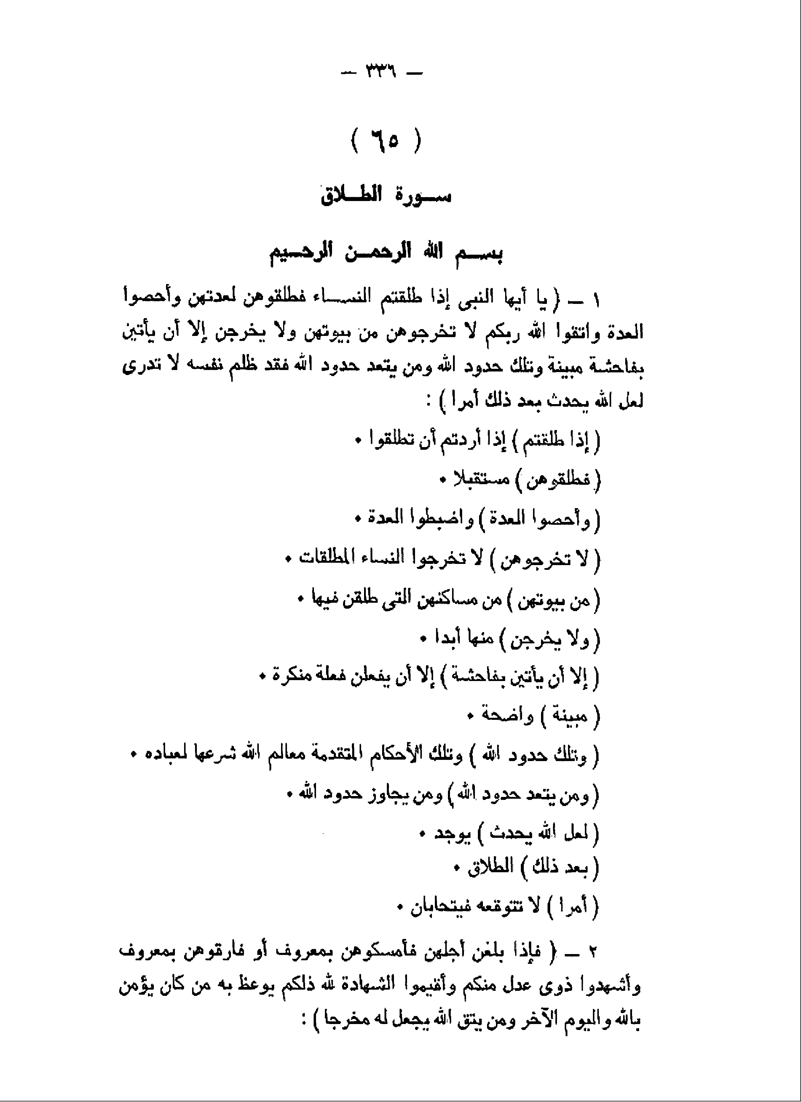 يا أَيُّهَا النَّبِيُّ إِذا طَلَّقْتُمُ النِّساءَ فَطَلِّقُوهُنَّ لِعِدَّتِهِنَّ وَأَحْصُوا الْعِدَّةَ وَاتَّقُوا اللَّهَ رَبَّكُمْ لا تُخْرِجُوهُنَّ مِنْ بُيُوتِهِنَّ وَلا يَخْرُجْنَ إِلاَّ أَنْ يَأْتِينَ بِفاحِشَةٍ مُبَيِّنَةٍ وَتِلْكَ حُدُودُ اللَّهِ وَمَنْ يَتَعَدَّ حُدُودَ اللَّهِ فَقَدْ ظَلَمَ نَفْسَهُ لا تَدْرِي لَعَلَّ اللَّهَ يُحْدِثُ بَعْدَ ذلِكَ أَمْراً (1) فَإِذا بَلَغْنَ أَجَلَهُنَّ فَأَمْسِكُوهُنَّ بِمَعْرُوفٍ أَوْ فارِقُوهُنَّ بِمَعْرُوفٍ وَأَشْهِدُوا ذَوَيْ عَدْلٍ مِنْكُمْ وَأَقِيمُوا الشَّهادَةَ لِلَّهِ ذلِكُمْ يُوعَظُ بِهِ مَنْ كانَ يُؤْمِنُ بِاللَّهِ وَالْيَوْمِ الْآخِرِ وَمَنْ يَتَّقِ اللَّهَ يَجْعَلْ لَهُ مَخْرَجاً (2)
