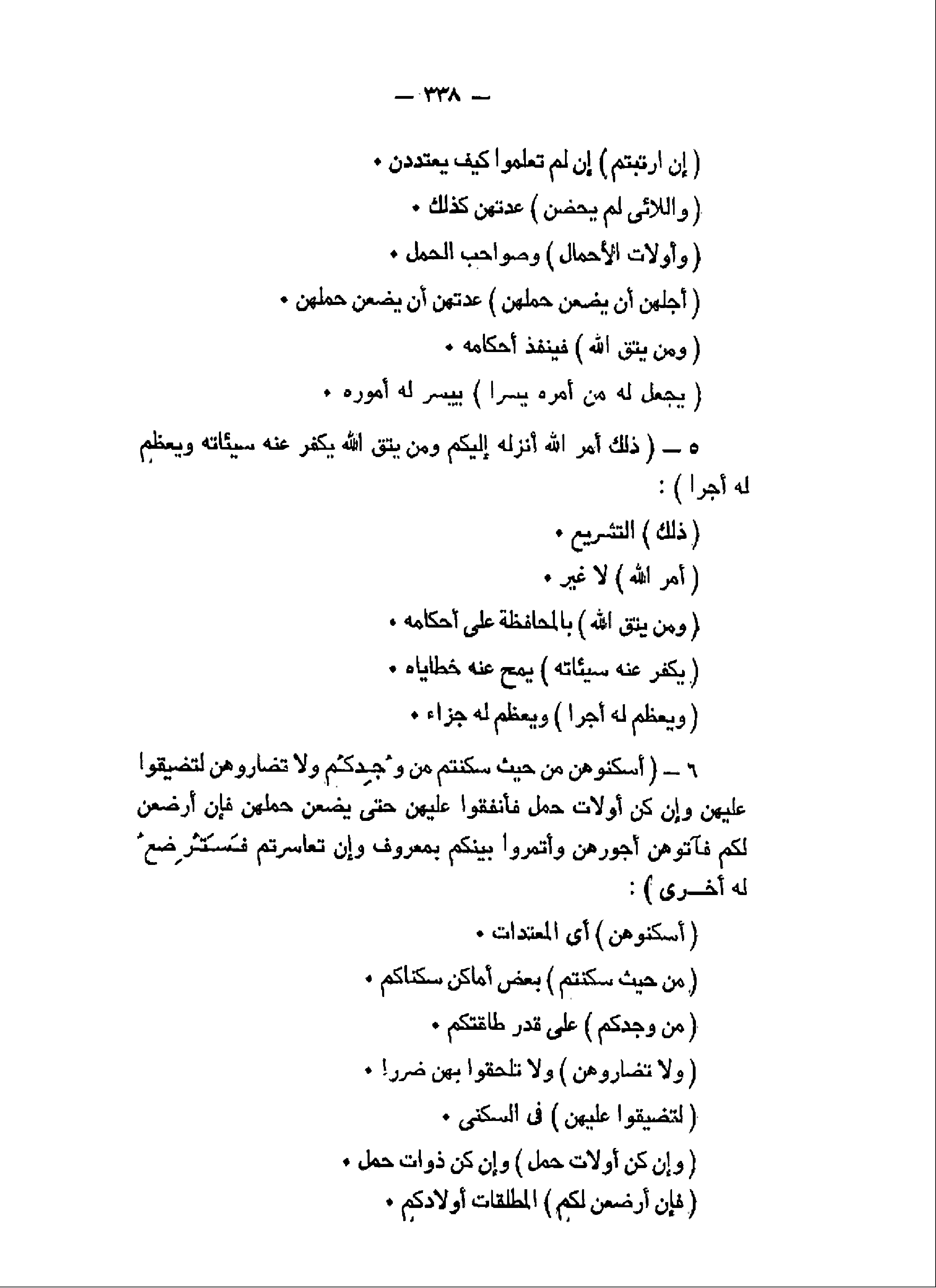 ذلِكَ أَمْرُ اللَّهِ أَنْزَلَهُ إِلَيْكُمْ وَمَنْ يَتَّقِ اللَّهَ يُكَفِّرْ عَنْهُ سَيِّئاتِهِ وَيُعْظِمْ لَهُ أَجْراً (5) أَسْكِنُوهُنَّ مِنْ حَيْثُ سَكَنْتُمْ مِنْ وُجْدِكُمْ وَلا تُضآرُّوهُنَّ لِتُضَيِّقُوا عَلَيْهِنَّ وَإِنْ كُنَّ أُولاتِ حَمْلٍ فَأَنْفِقُوا عَلَيْهِنَّ حَتَّى يَضَعْنَ حَمْلَهُنَّ فَإِنْ أَرْضَعْنَ لَكُمْ فَآتُوهُنَّ أُجُورَهُنَّ وَأْتَمِرُوا بَيْنَكُمْ بِمَعْرُوفٍ وَإِنْ تَعاسَرْتُمْ فَسَتُرْضِعُ لَهُ أُخْرى (6)