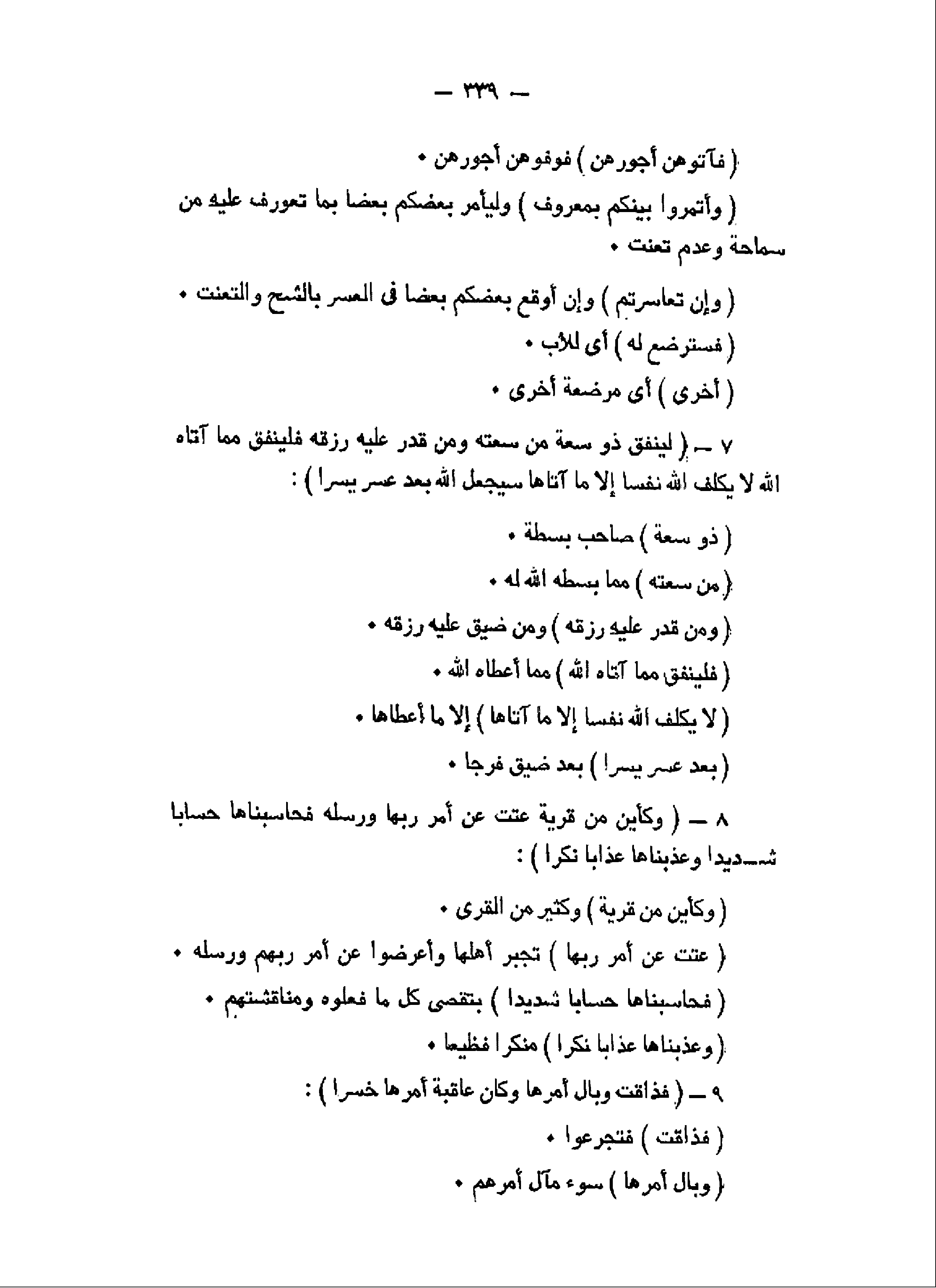 لِيُنْفِقْ ذُو سَعَةٍ مِنْ سَعَتِهِ وَمَنْ قُدِرَ عَلَيْهِ رِزْقُهُ فَلْيُنْفِقْ مِمَّا آتاهُ اللَّهُ لا يُكَلِّفُ اللَّهُ نَفْساً إِلاَّ ما آتاها سَيَجْعَلُ اللَّهُ بَعْدَ عُسْرٍ يُسْراً (7) وَكَأَيِّنْ مِنْ قَرْيَةٍ عَتَتْ عَنْ أَمْرِ رَبِّها وَرُسُلِهِ فَحاسَبْناها حِساباً شَدِيداً وَعَذَّبْناها عَذاباً نُكْراً (8) فَذاقَتْ وَبالَ أَمْرِها وَكانَ عاقِبَةُ أَمْرِها خُسْراً (9)