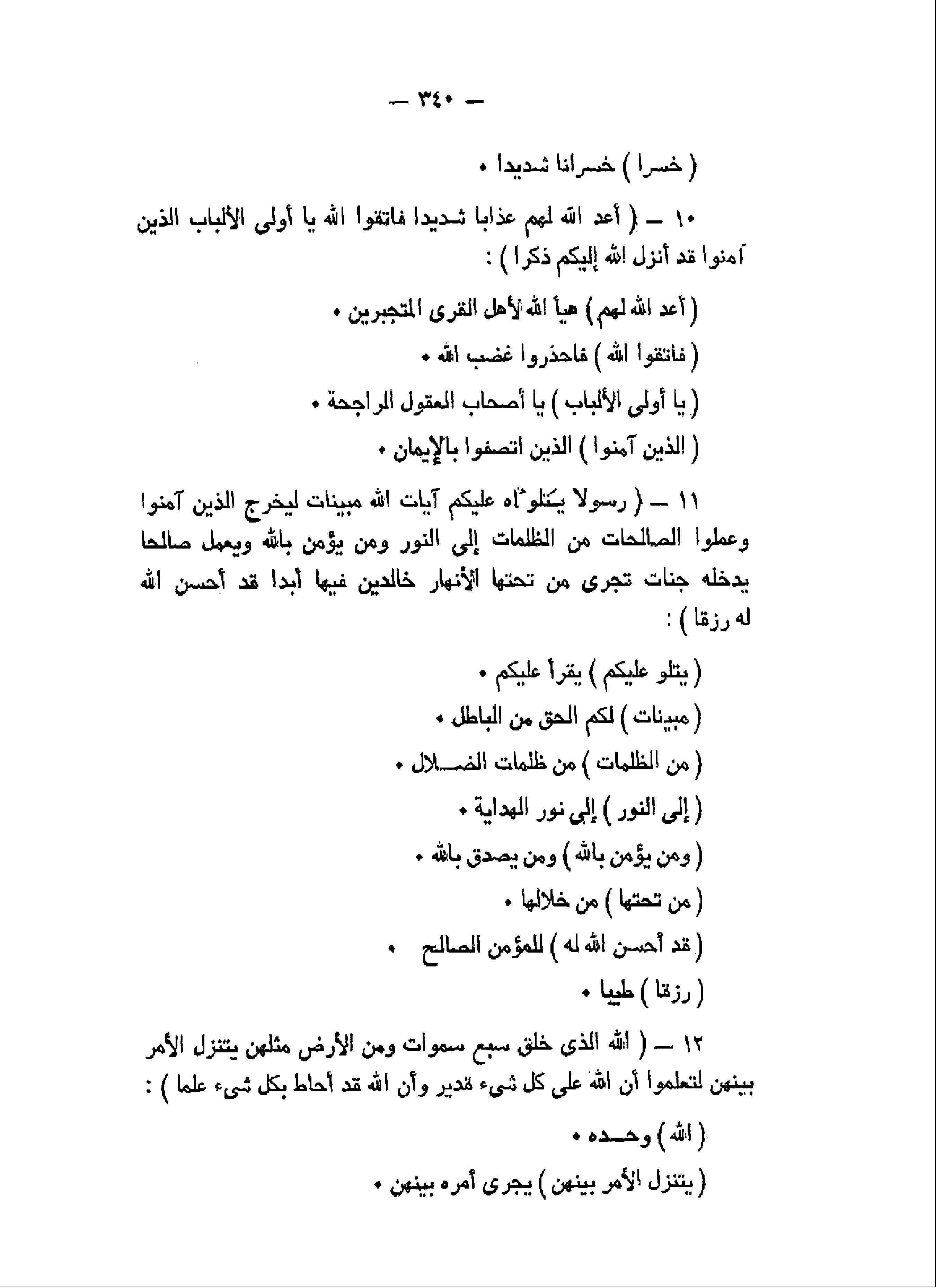أَعَدَّ اللَّهُ لَهُمْ عَذاباً شَدِيداً فَاتَّقُوا اللَّهَ يا أُولِي الْأَلْبابِ الَّذِينَ آمَنُوا قَدْ أَنْزَلَ اللَّهُ إِلَيْكُمْ ذِكْراً (10) رَسُولاً يَتْلُوا عَلَيْكُمْ آياتِ اللَّهِ مُبَيِّناتٍ لِيُخْرِجَ الَّذِينَ آمَنُوا وَعَمِلُوا الصَّالِحاتِ مِنَ الظُّلُماتِ إِلَى النُّورِ وَمَنْ يُؤْمِنْ بِاللَّهِ وَيَعْمَلْ صالِحاً يُدْخِلْهُ جَنَّاتٍ تَجْرِي مِنْ تَحْتِهَا الْأَنْهارُ خالِدِينَ فِيها أَبَداً قَدْ أَحْسَنَ اللَّهُ لَهُ رِزْقاً (11) اللَّهُ الَّذِي خَلَقَ سَبْعَ سَماواتٍ وَمِنَ الْأَرْضِ مِثْلَهُنَّ يَتَنَزَّلُ الْأَمْرُ بَيْنَهُنَّ لِتَعْلَمُوا أَنَّ اللَّهَ عَلى كُلِّ شَيْءٍ قَدِيرٌ وَأَنَّ اللَّهَ قَدْ أَحاطَ بِكُلِّ شَيْءٍ عِلْماً (12)