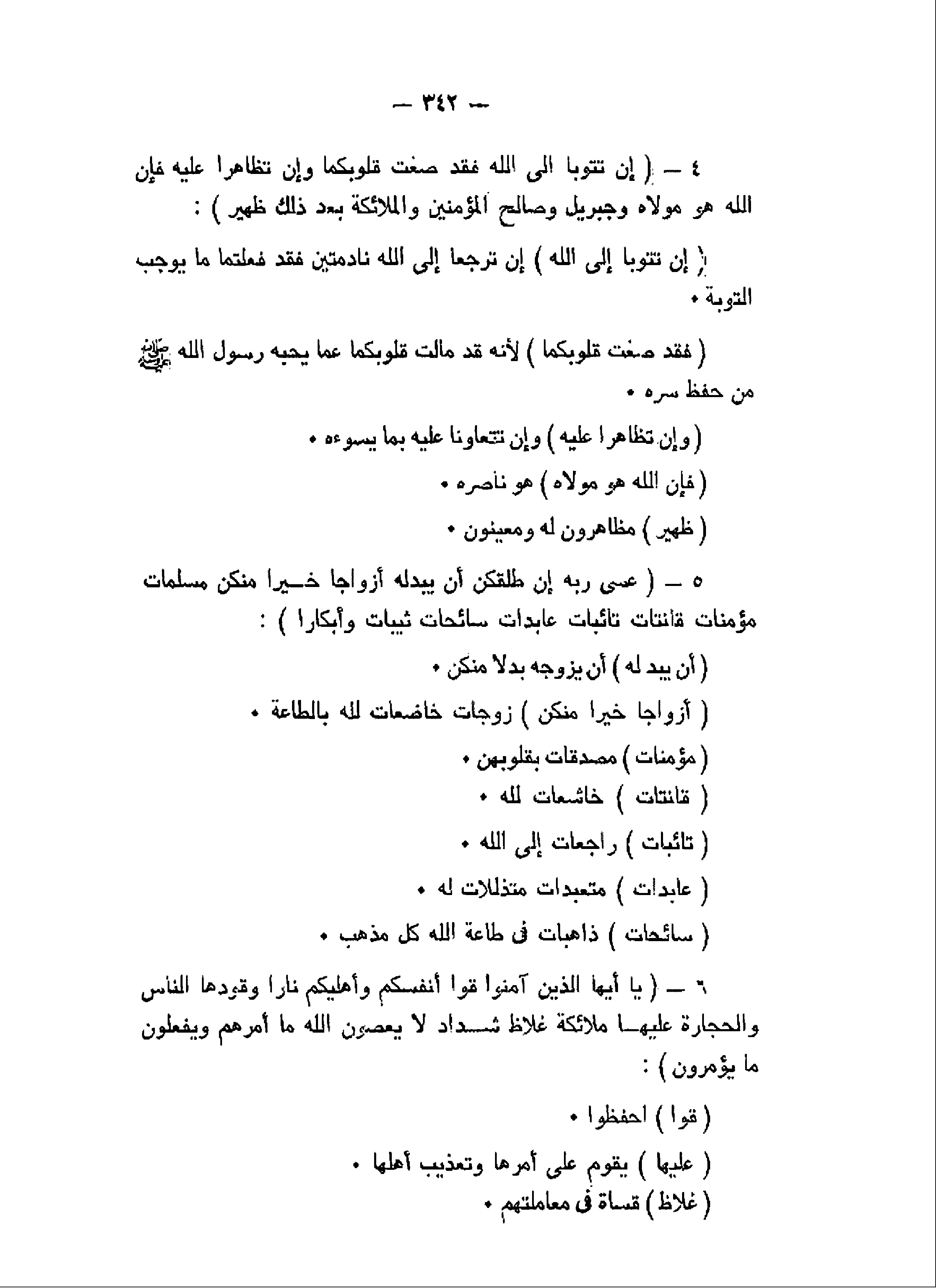 إِنْ تَتُوبا إِلَى اللَّهِ فَقَدْ صَغَتْ قُلُوبُكُما وَإِنْ تَظاهَرا عَلَيْهِ فَإِنَّ اللَّهَ هُوَ مَوْلاهُ وَجِبْرِيلُ وَصالِحُ الْمُؤْمِنِينَ وَالْمَلائِكَةُ بَعْدَ ذلِكَ ظَهِيرٌ (4) عَسى رَبُّهُ إِنْ طَلَّقَكُنَّ أَنْ يُبْدِلَهُ أَزْواجاً خَيْراً مِنْكُنَّ مُسْلِماتٍ مُؤْمِناتٍ قانِتاتٍ تائِباتٍ عابِداتٍ سائِحاتٍ ثَيِّباتٍ وَأَبْكاراً (5) يا أَيُّهَا الَّذِينَ آمَنُوا قُوا أَنْفُسَكُمْ وَأَهْلِيكُمْ ناراً وَقُودُهَا النَّاسُ وَالْحِجارَةُ عَلَيْها مَلائِكَةٌ غِلاظٌ شِدادٌ لا يَعْصُونَ اللَّهَ ما أَمَرَهُمْ وَيَفْعَلُونَ ما يُؤْمَرُونَ (6)