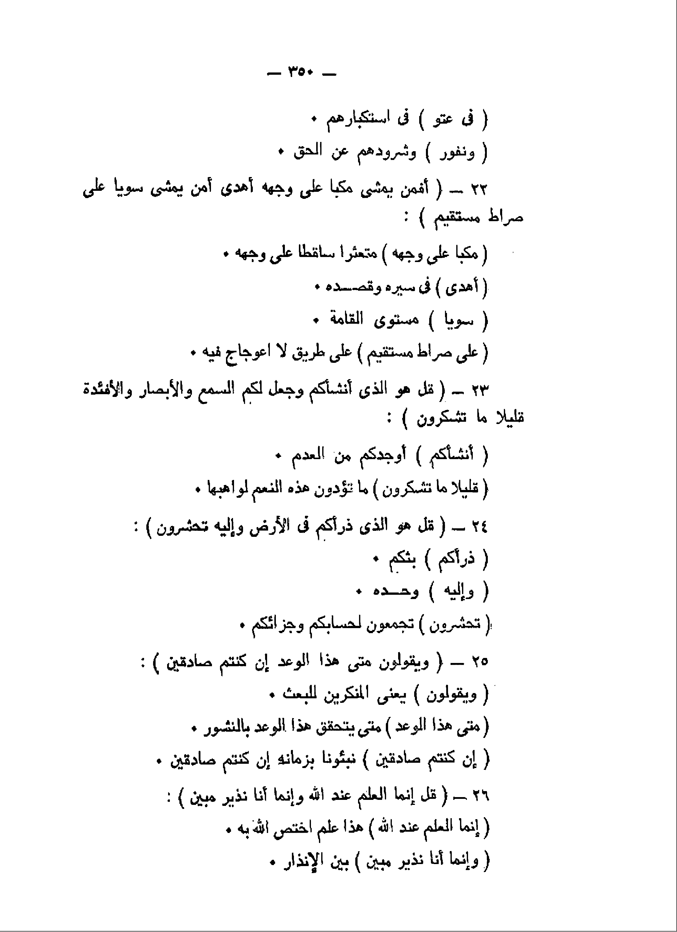 أَفَمَنْ يَمْشِي مُكِبًّا عَلى وَجْهِهِ أَهْدى أَمَّنْ يَمْشِي سَوِيًّا عَلى صِراطٍ مُسْتَقِيمٍ (22) قُلْ هُوَ الَّذِي أَنْشَأَكُمْ وَجَعَلَ لَكُمُ السَّمْعَ وَالْأَبْصارَ وَالْأَفْئِدَةَ قَلِيلاً ما تَشْكُرُونَ (23) قُلْ هُوَ الَّذِي ذَرَأَكُمْ فِي الْأَرْضِ وَإِلَيْهِ تُحْشَرُونَ (24) وَيَقُولُونَ مَتى هذَا الْوَعْدُ إِنْ كُنْتُمْ صادِقِينَ (25) قُلْ إِنَّمَا الْعِلْمُ عِنْدَ اللَّهِ وَإِنَّما أَنَا نَذِيرٌ مُبِينٌ (26)