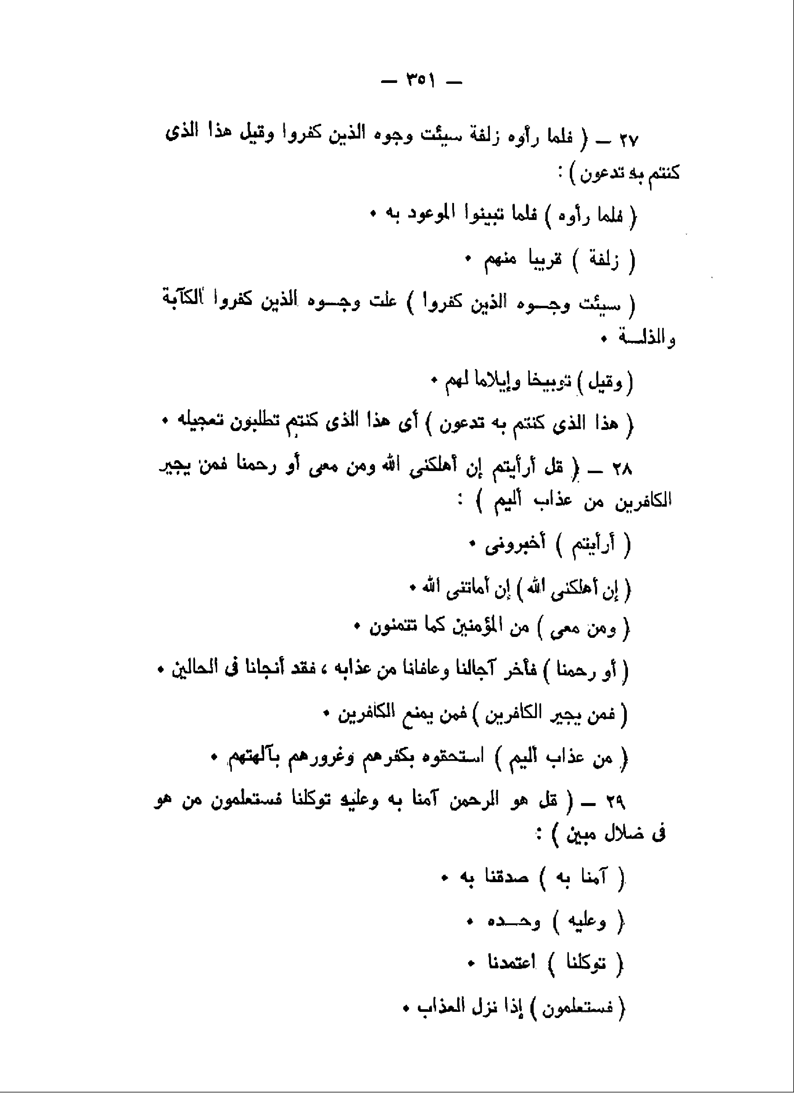 فَلَمَّا رَأَوْهُ زُلْفَةً سِيئَتْ وُجُوهُ الَّذِينَ كَفَرُوا وَقِيلَ هذَا الَّذِي كُنْتُمْ بِهِ تَدَّعُونَ (27) قُلْ أَرَأَيْتُمْ إِنْ أَهْلَكَنِيَ اللَّهُ وَمَنْ مَعِيَ أَوْ رَحِمَنا فَمَنْ يُجِيرُ الْكافِرِينَ مِنْ عَذابٍ أَلِيمٍ (28) قُلْ هُوَ الرَّحْمنُ آمَنَّا بِهِ وَعَلَيْهِ تَوَكَّلْنا فَسَتَعْلَمُونَ مَنْ هُوَ فِي ضَلالٍ مُبِينٍ (29)