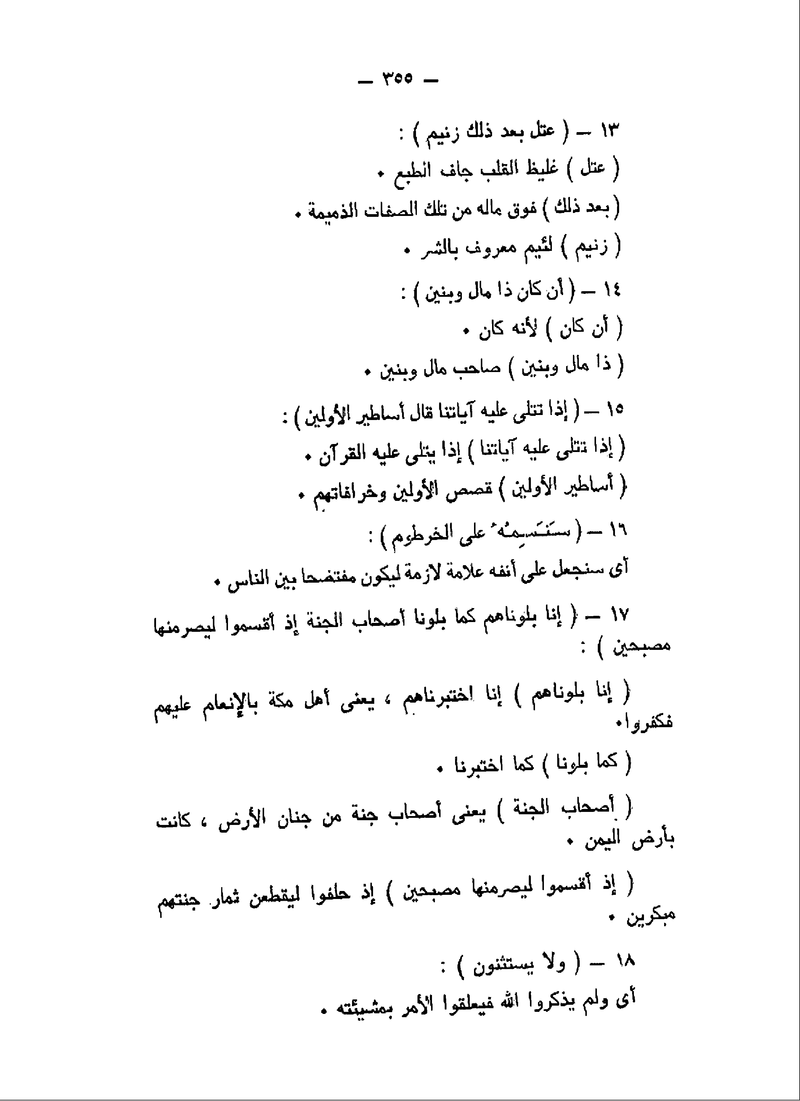 عُتُلٍّ بَعْدَ ذلِكَ زَنِيمٍ (13) أَنْ كانَ ذا مالٍ وَبَنِينَ (14) إِذا تُتْلى عَلَيْهِ آياتُنا قالَ أَساطِيرُ الْأَوَّلِينَ (15) سَنَسِمُهُ عَلَى الْخُرْطُومِ (16) إِنَّا بَلَوْناهُمْ كَما بَلَوْنا أَصْحابَ الْجَنَّةِ إِذْ أَقْسَمُوا لَيَصْرِمُنَّها مُصْبِحِينَ (17)