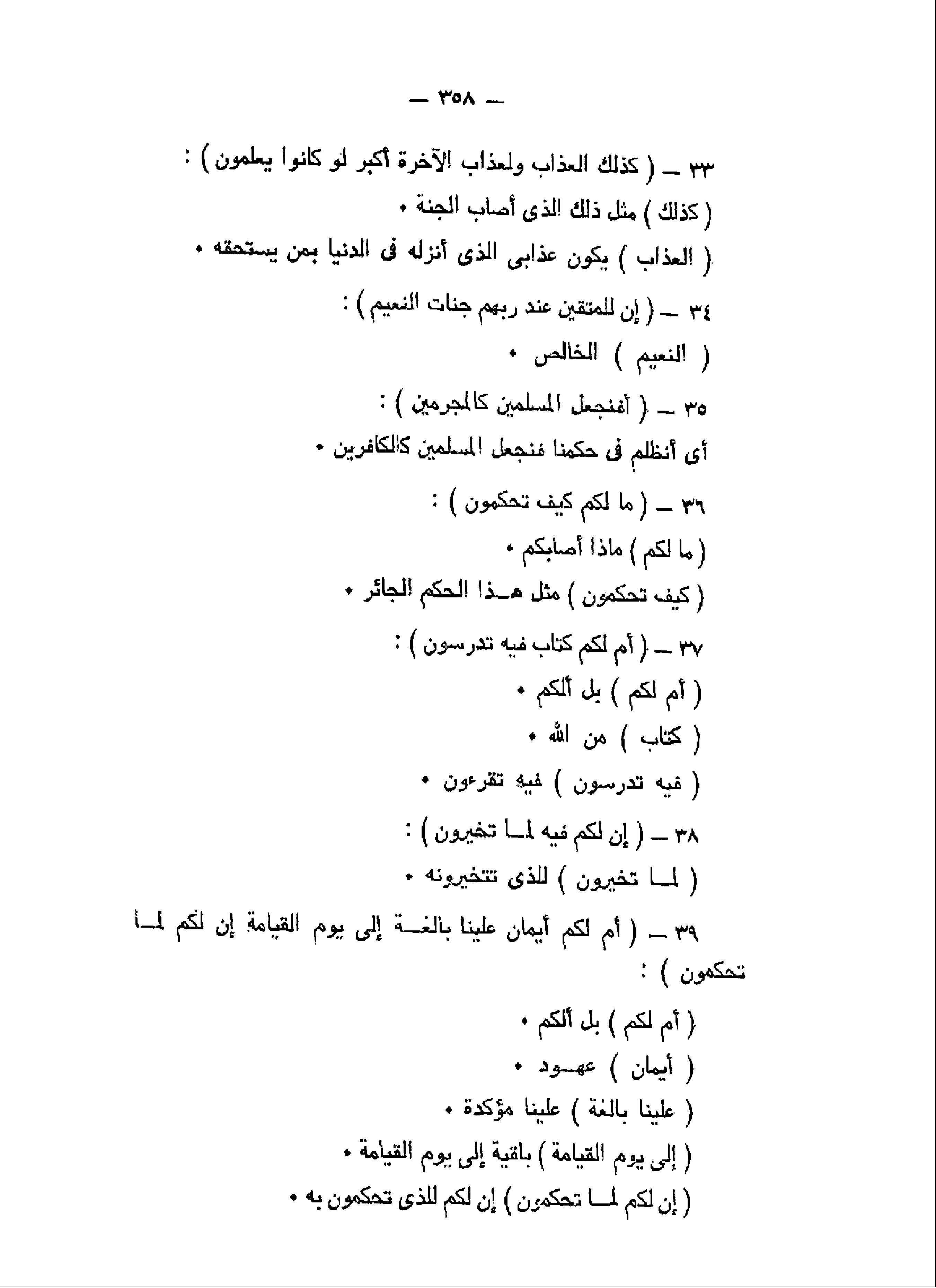 كَذلِكَ الْعَذابُ وَلَعَذابُ الْآخِرَةِ أَكْبَرُ لَوْ كانُوا يَعْلَمُونَ (33) إِنَّ لِلْمُتَّقِينَ عِنْدَ رَبِّهِمْ جَنَّاتِ النَّعِيمِ (34) أَفَنَجْعَلُ الْمُسْلِمِينَ كَالْمُجْرِمِينَ (35) ما لَكُمْ كَيْفَ تَحْكُمُونَ (36) أَمْ لَكُمْ كِتابٌ فِيهِ تَدْرُسُونَ (37)