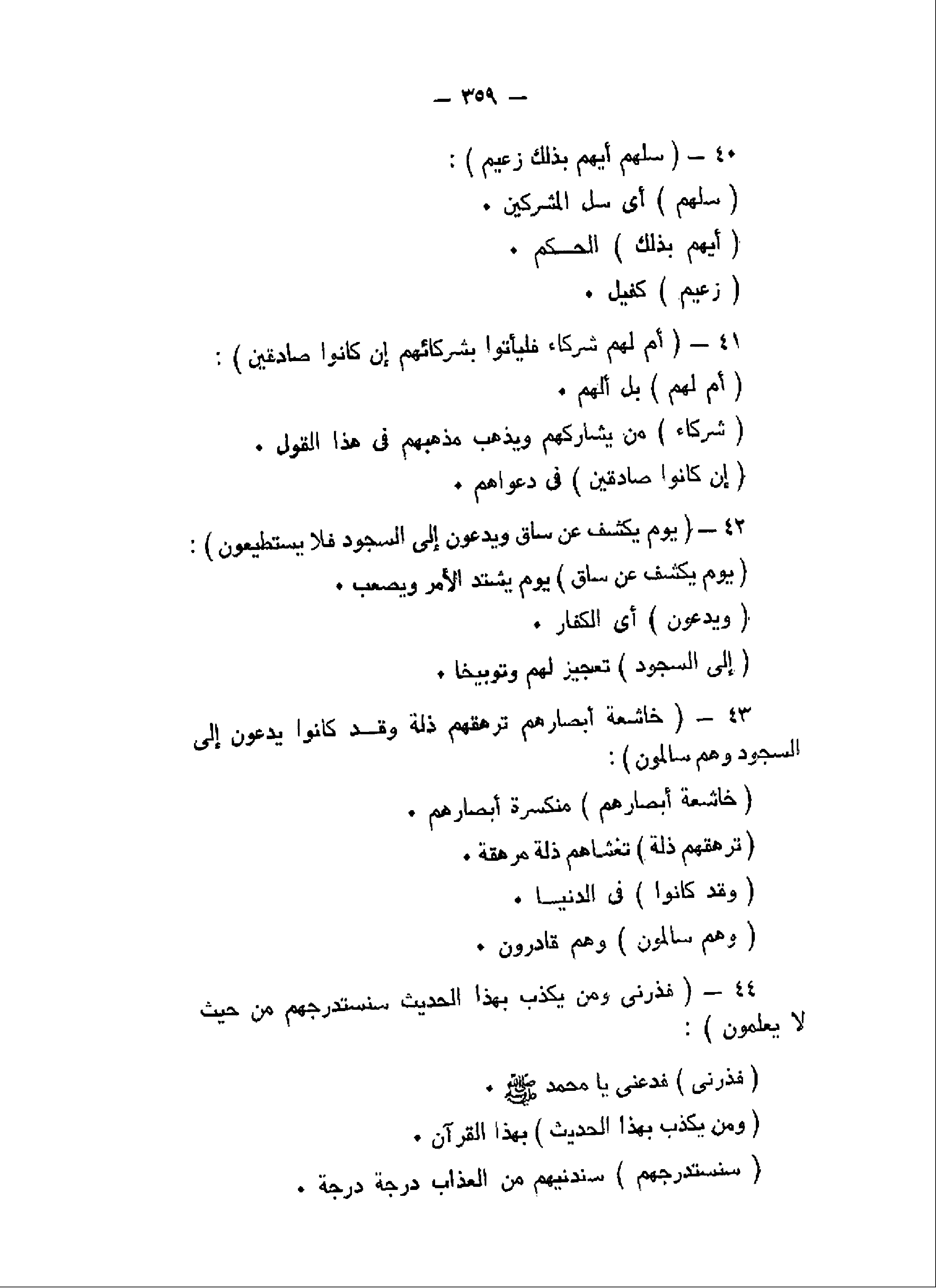سَلْهُمْ أَيُّهُمْ بِذلِكَ زَعِيمٌ (40) أَمْ لَهُمْ شُرَكاءُ فَلْيَأْتُوا بِشُرَكائِهِمْ إِنْ كانُوا صادِقِينَ (41) يَوْمَ يُكْشَفُ عَنْ ساقٍ وَيُدْعَوْنَ إِلَى السُّجُودِ فَلا يَسْتَطِيعُونَ (42) خاشِعَةً أَبْصارُهُمْ تَرْهَقُهُمْ ذِلَّةٌ وَقَدْ كانُوا يُدْعَوْنَ إِلَى السُّجُودِ وَهُمْ سالِمُونَ (43) فَذَرْنِي وَمَنْ يُكَذِّبُ بِهذَا الْحَدِيثِ سَنَسْتَدْرِجُهُمْ مِنْ حَيْثُ لا يَعْلَمُونَ (44)