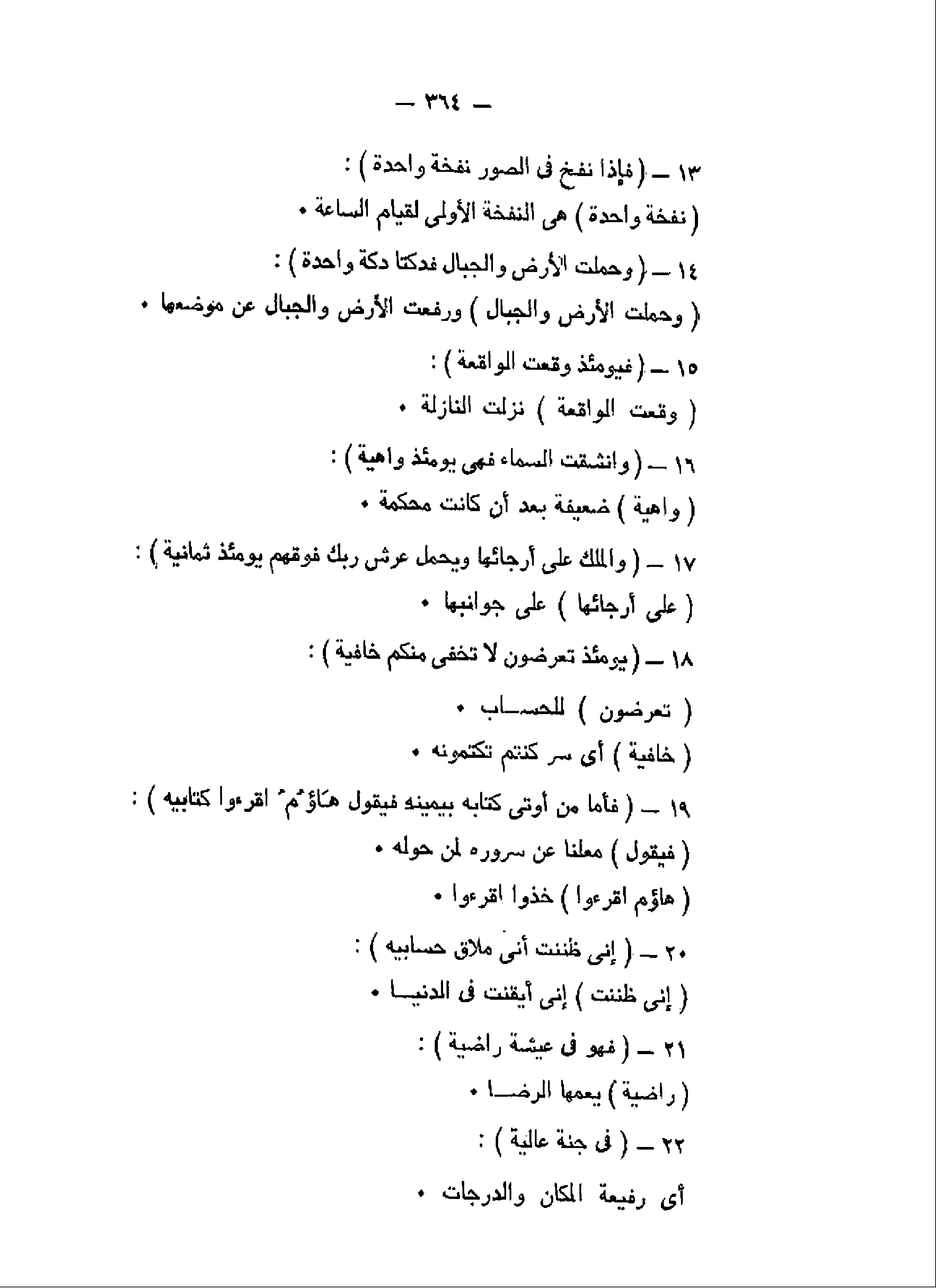 فَإِذا نُفِخَ فِي الصُّورِ نَفْخَةٌ واحِدَةٌ (13) وَحُمِلَتِ الْأَرْضُ وَالْجِبالُ فَدُكَّتا دَكَّةً واحِدَةً (14) فَيَوْمَئِذٍ وَقَعَتِ الْواقِعَةُ (15) وَانْشَقَّتِ السَّماءُ فَهِيَ يَوْمَئِذٍ واهِيَةٌ (16) وَالْمَلَكُ عَلى أَرْجائِها وَيَحْمِلُ عَرْشَ رَبِّكَ فَوْقَهُمْ يَوْمَئِذٍ ثَمانِيَةٌ (17)