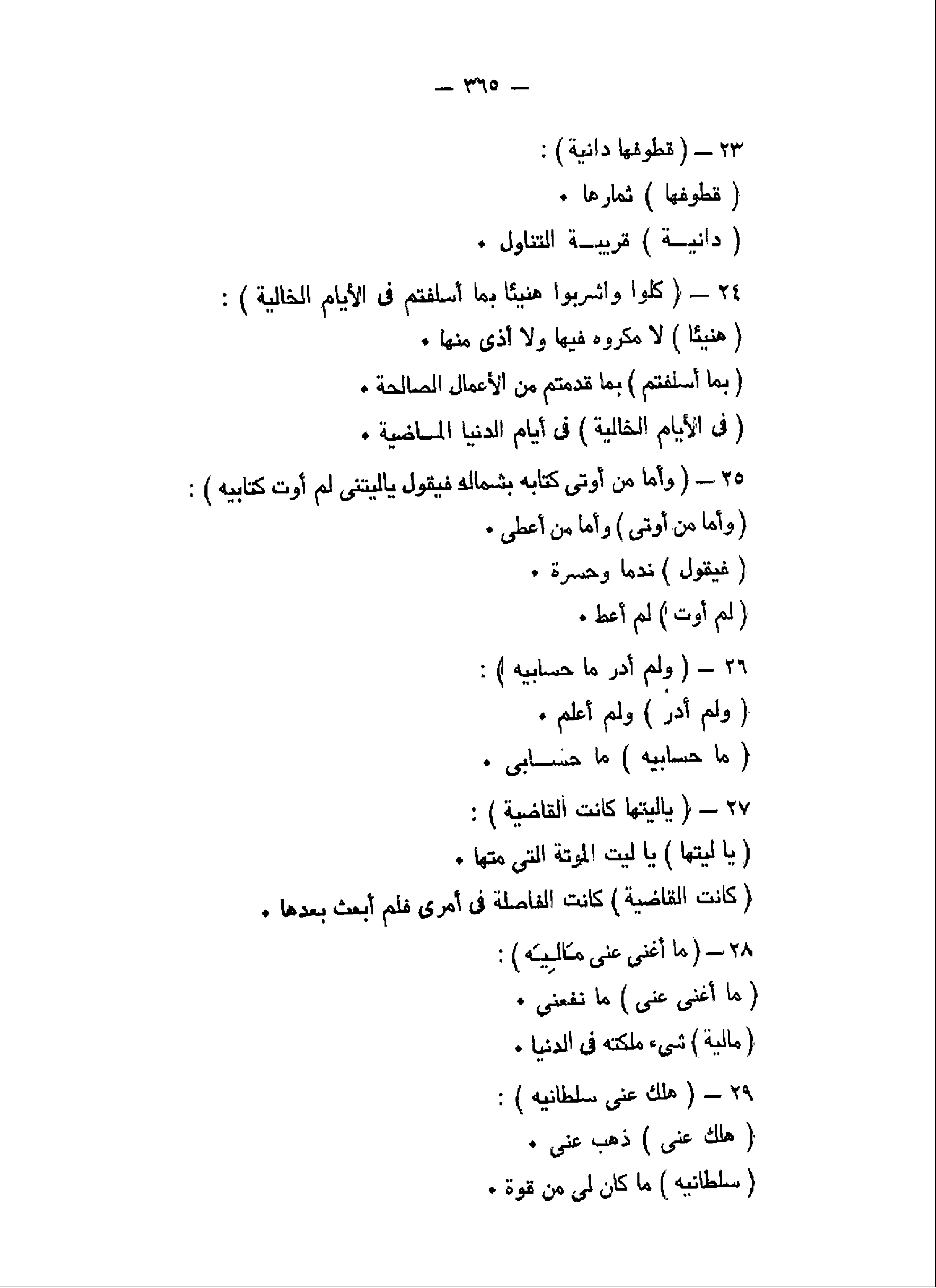 قُطُوفُها دانِيَةٌ (23) كُلُوا وَاشْرَبُوا هَنِيئاً بِما أَسْلَفْتُمْ فِي الْأَيَّامِ الْخالِيَةِ (24) وَأَمَّا مَنْ أُوتِيَ كِتابَهُ بِشِمالِهِ فَيَقُولُ يا لَيْتَنِي لَمْ أُوتَ كِتابِيَهْ (25) وَلَمْ أَدْرِ ما حِسابِيَهْ (26) يا لَيْتَها كانَتِ الْقاضِيَةَ (27)