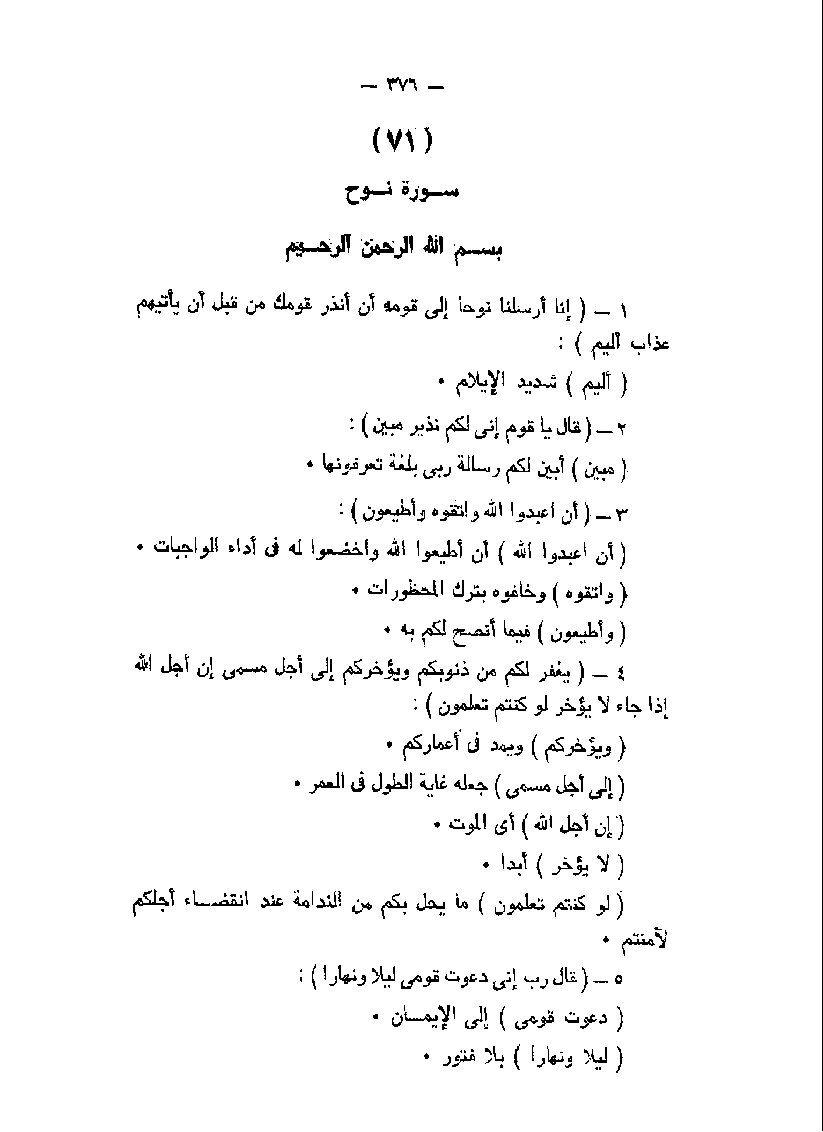 إِنَّا أَرْسَلْنا نُوحاً إِلى قَوْمِهِ أَنْ أَنْذِرْ قَوْمَكَ مِنْ قَبْلِ أَنْ يَأْتِيَهُمْ عَذابٌ أَلِيمٌ (1) قالَ يا قَوْمِ إِنِّي لَكُمْ نَذِيرٌ مُبِينٌ (2) أَنِ اعْبُدُوا اللَّهَ وَاتَّقُوهُ وَأَطِيعُونِ (3) يَغْفِرْ لَكُمْ مِنْ ذُنُوبِكُمْ وَيُؤَخِّرْكُمْ إِلى أَجَلٍ مُسَمًّى إِنَّ أَجَلَ اللَّهِ إِذا جاءَ لا يُؤَخَّرُ لَوْ كُنْتُمْ تَعْلَمُونَ (4)