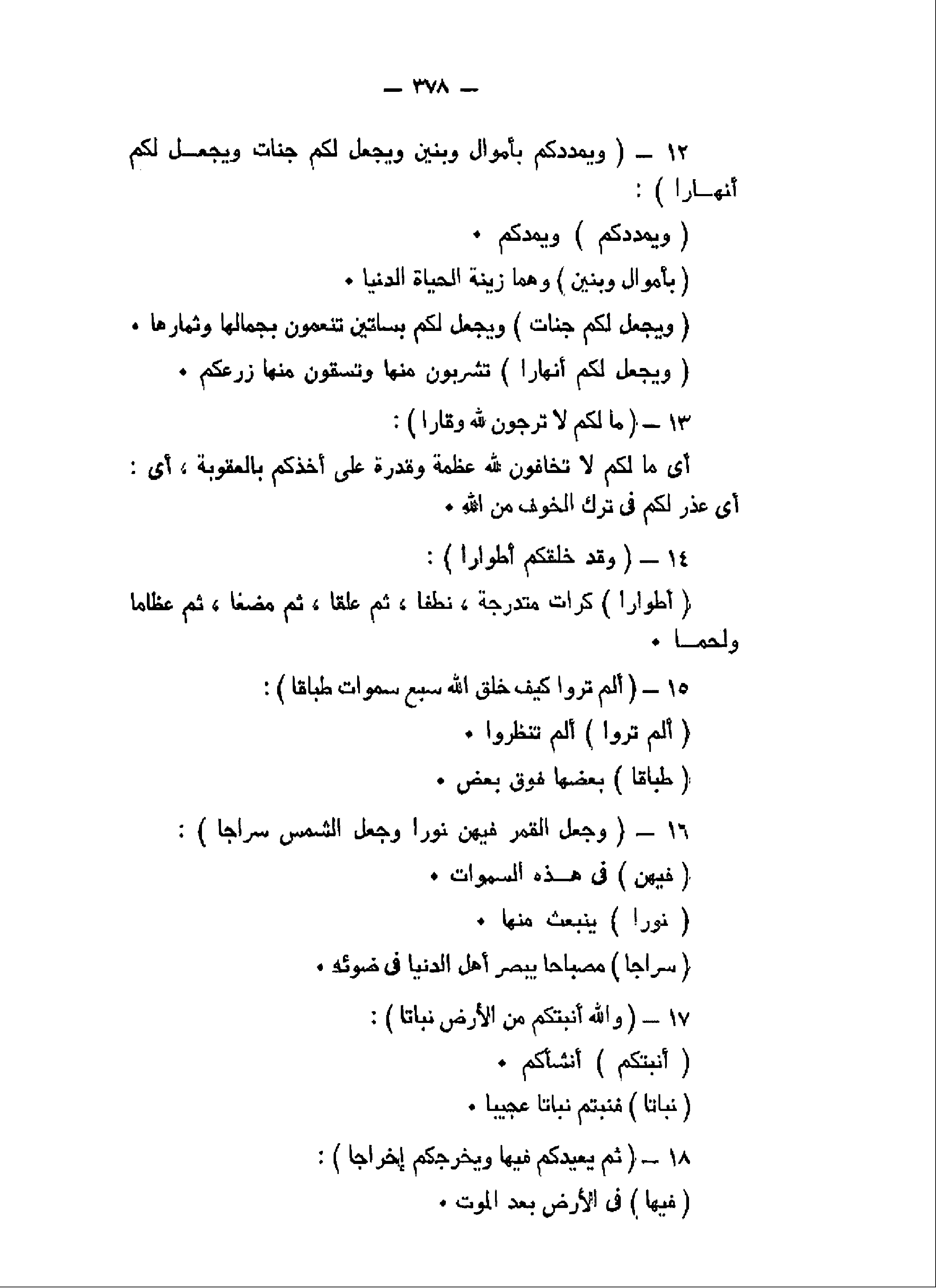 وَيُمْدِدْكُمْ بِأَمْوالٍ وَبَنِينَ وَيَجْعَلْ لَكُمْ جَنَّاتٍ وَيَجْعَلْ لَكُمْ أَنْهاراً (12) ما لَكُمْ لا تَرْجُونَ لِلَّهِ وَقاراً (13) وَقَدْ خَلَقَكُمْ أَطْواراً (14) أَلَمْ تَرَوْا كَيْفَ خَلَقَ اللَّهُ سَبْعَ سَماواتٍ طِباقاً (15) وَجَعَلَ الْقَمَرَ فِيهِنَّ نُوراً وَجَعَلَ الشَّمْسَ سِراجاً (16)