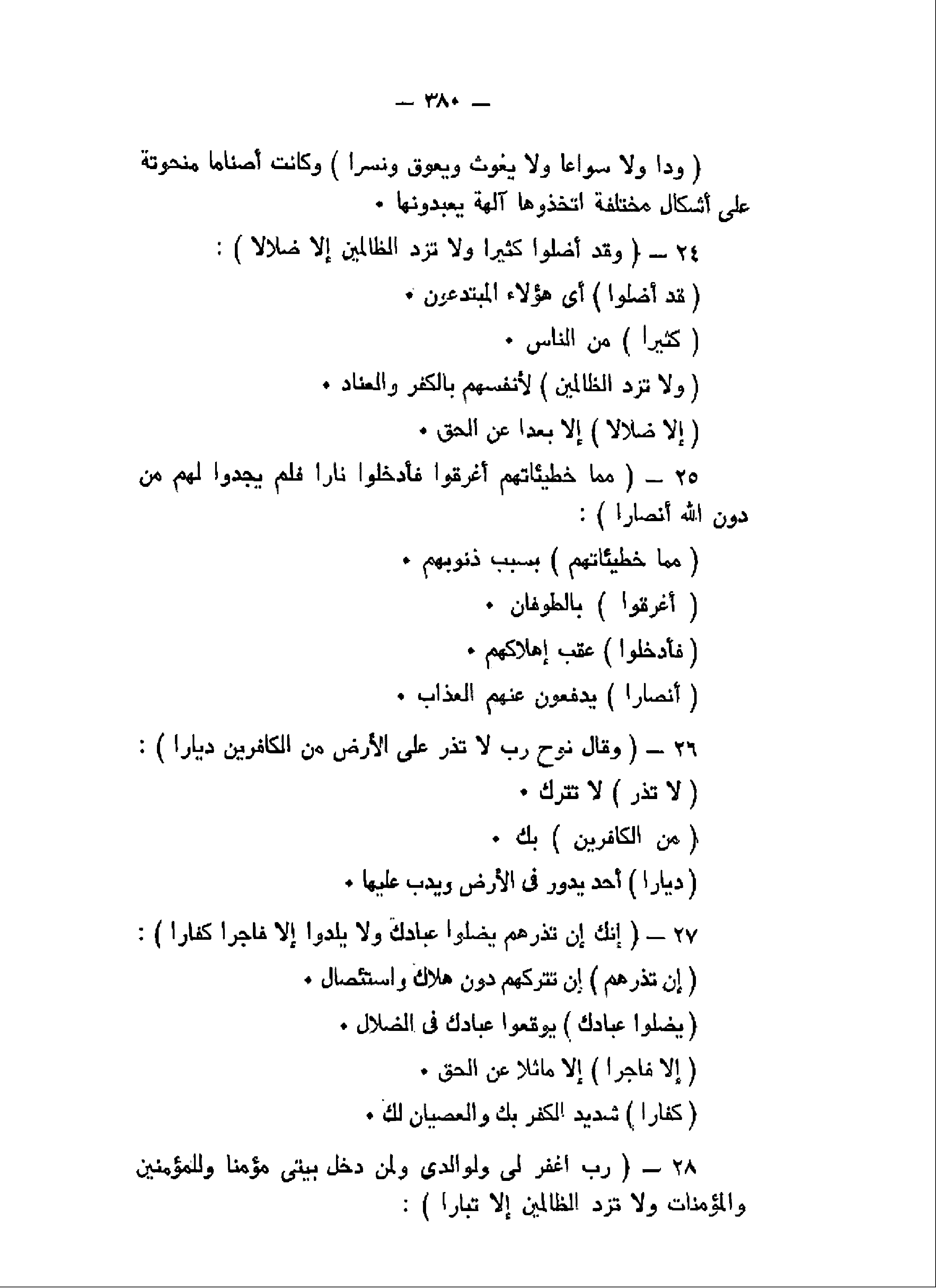 وَقَدْ أَضَلُّوا كَثِيراً وَلا تَزِدِ الظَّالِمِينَ إِلاَّ ضَلالاً (24) مِمَّا خَطِيئاتِهِمْ أُغْرِقُوا فَأُدْخِلُوا ناراً فَلَمْ يَجِدُوا لَهُمْ مِنْ دُونِ اللَّهِ أَنْصاراً (25) وَقالَ نُوحٌ رَبِّ لا تَذَرْ عَلَى الْأَرْضِ مِنَ الْكافِرِينَ دَيَّاراً (26) إِنَّكَ إِنْ تَذَرْهُمْ يُضِلُّوا عِبادَكَ وَلا يَلِدُوا إِلاَّ فاجِراً كَفَّاراً (27) رَبِّ اغْفِرْ لِي وَلِوالِدَيَّ وَلِمَنْ دَخَلَ بَيْتِيَ مُؤْمِناً وَلِلْمُؤْمِنِينَ وَالْمُؤْمِناتِ وَلا تَزِدِ الظَّالِمِينَ إِلاَّ تَباراً (28)
