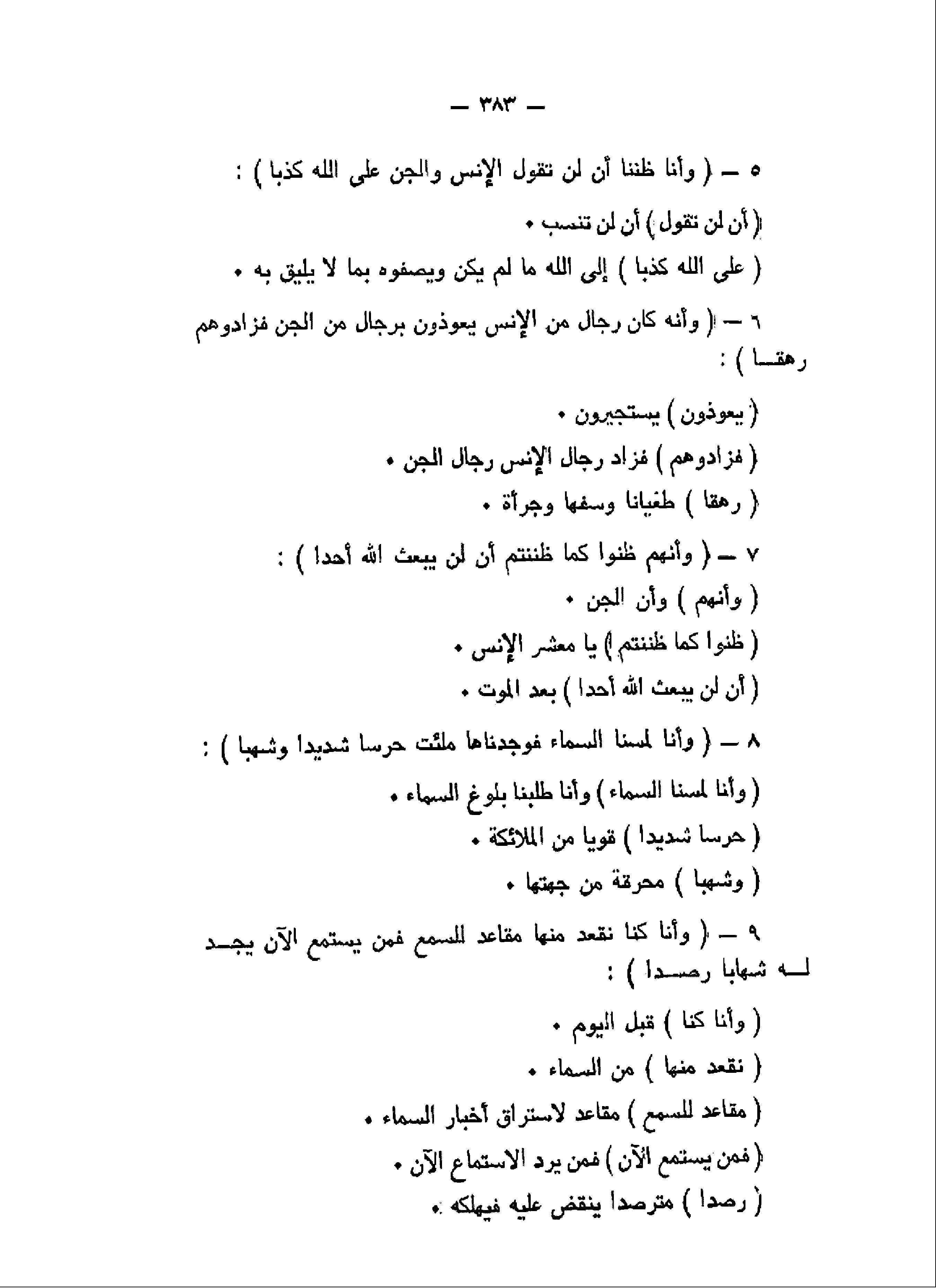 وَأَنَّا ظَنَنَّا أَنْ لَنْ تَقُولَ الْإِنْسُ وَالْجِنُّ عَلَى اللَّهِ كَذِباً (5) وَأَنَّهُ كانَ رِجالٌ مِنَ الْإِنْسِ يَعُوذُونَ بِرِجالٍ مِنَ الْجِنِّ فَزادُوهُمْ رَهَقاً (6) وَأَنَّهُمْ ظَنُّوا كَما ظَنَنْتُمْ أَنْ لَنْ يَبْعَثَ اللَّهُ أَحَداً (7) وَأَنَّا لَمَسْنَا السَّماءَ فَوَجَدْناها مُلِئَتْ حَرَساً شَدِيداً وَشُهُباً (8) وَأَنَّا كُنَّا نَقْعُدُ مِنْها مَقاعِدَ لِلسَّمْعِ فَمَنْ يَسْتَمِعِ الْآنَ يَجِدْ لَهُ شِهاباً رَصَداً (9)