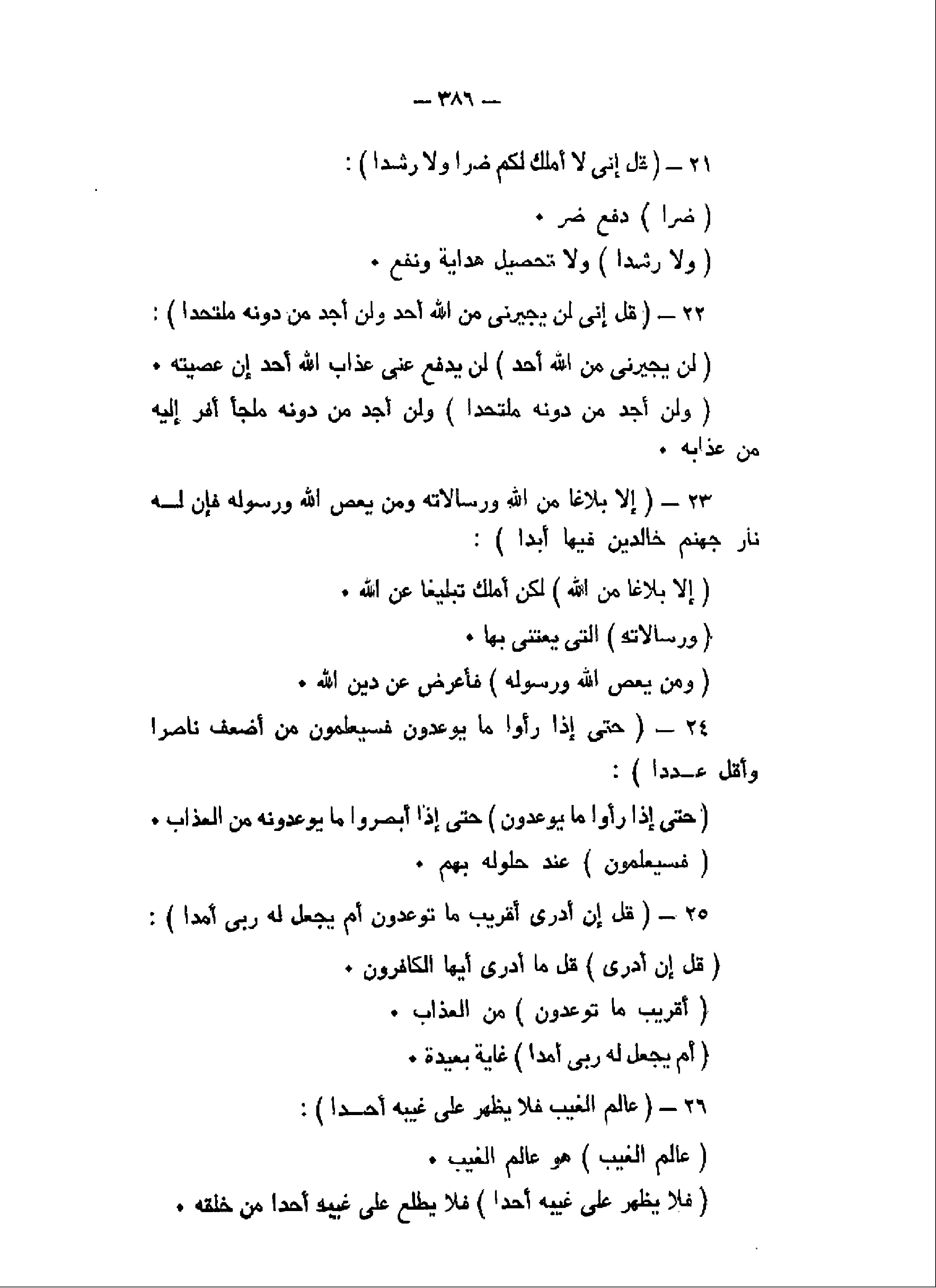 قُلْ إِنِّي لا أَمْلِكُ لَكُمْ ضَرًّا وَلا رَشَداً (21) قُلْ إِنِّي لَنْ يُجِيرَنِي مِنَ اللَّهِ أَحَدٌ وَلَنْ أَجِدَ مِنْ دُونِهِ مُلْتَحَداً (22) إِلاَّ بَلاغاً مِنَ اللَّهِ وَرِسالاتِهِ وَمَنْ يَعْصِ اللَّهَ وَرَسُولَهُ فَإِنَّ لَهُ نارَ جَهَنَّمَ خالِدِينَ فِيها أَبَداً (23) حَتَّى إِذا رَأَوْا ما يُوعَدُونَ فَسَيَعْلَمُونَ مَنْ أَضْعَفُ ناصِراً وَأَقَلُّ عَدَداً (24) قُلْ إِنْ أَدْرِي أَقَرِيبٌ ما تُوعَدُونَ أَمْ يَجْعَلُ لَهُ رَبِّي أَمَداً (25)