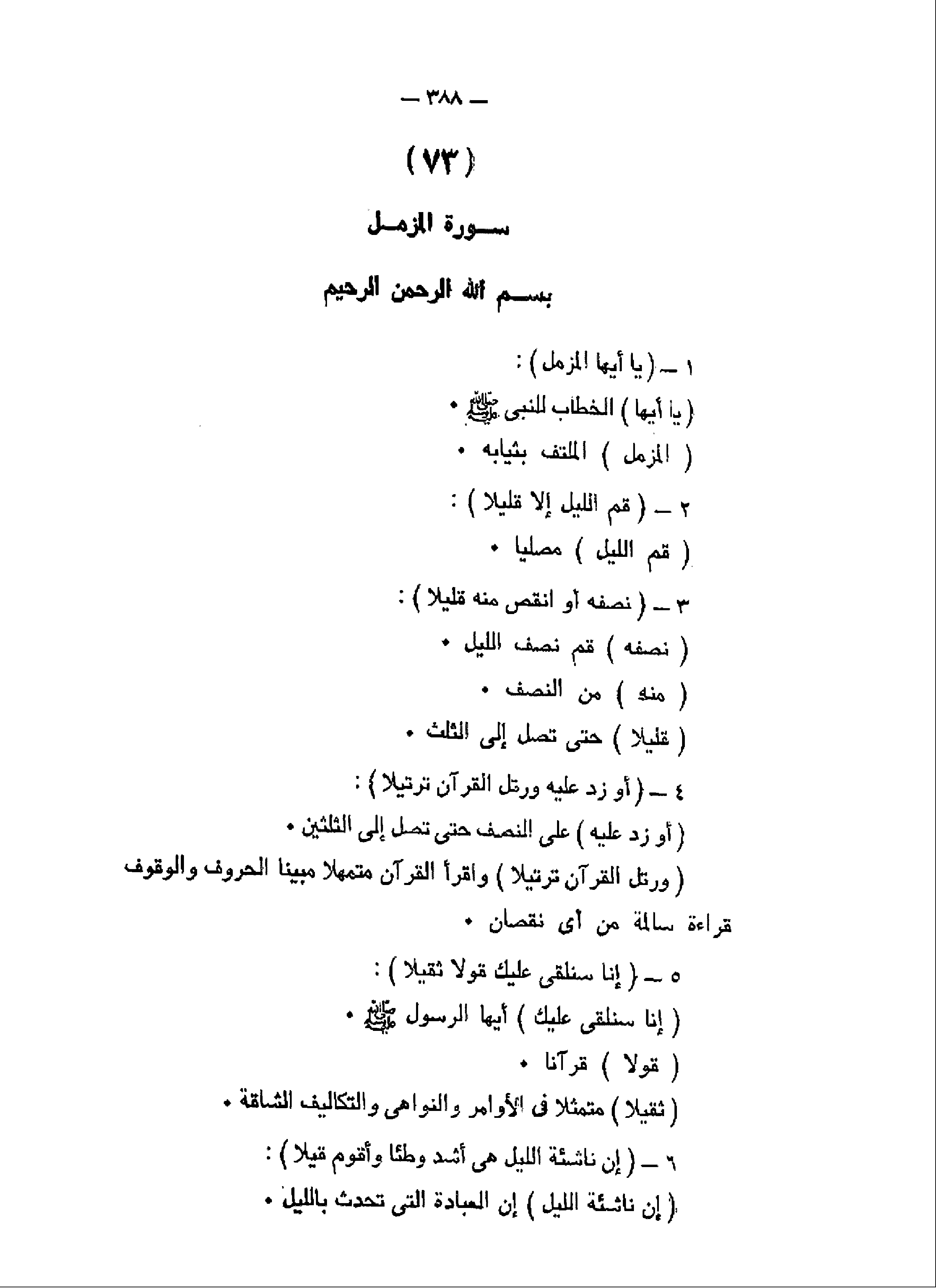 يا أَيُّهَا الْمُزَّمِّلُ (1) قُمِ اللَّيْلَ إِلاَّ قَلِيلاً (2) نِصْفَهُ أَوِ انْقُصْ مِنْهُ قَلِيلاً (3) أَوْ زِدْ عَلَيْهِ وَرَتِّلِ الْقُرْآنَ تَرْتِيلاً (4)