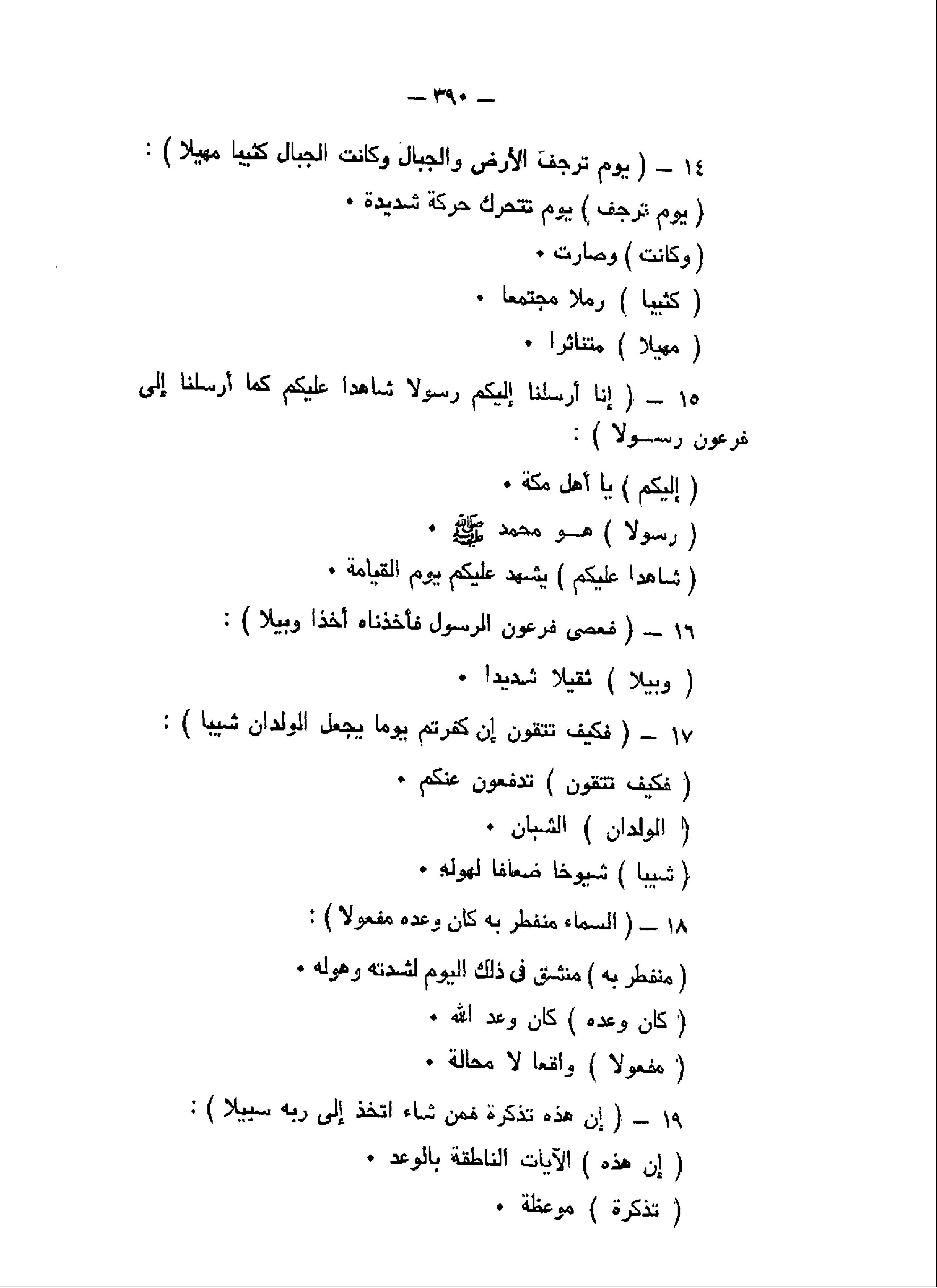 يَوْمَ تَرْجُفُ الْأَرْضُ وَالْجِبالُ وَكانَتِ الْجِبالُ كَثِيباً مَهِيلاً (14) إِنَّا أَرْسَلْنا إِلَيْكُمْ رَسُولاً شاهِداً عَلَيْكُمْ كَما أَرْسَلْنا إِلى فِرْعَوْنَ رَسُولاً (15) فَعَصى فِرْعَوْنُ الرَّسُولَ فَأَخَذْناهُ أَخْذاً وَبِيلاً (16) فَكَيْفَ تَتَّقُونَ إِنْ كَفَرْتُمْ يَوْماً يَجْعَلُ الْوِلْدانَ شِيباً (17) السَّماءُ مُنْفَطِرٌ بِهِ كانَ وَعْدُهُ مَفْعُولاً (18)