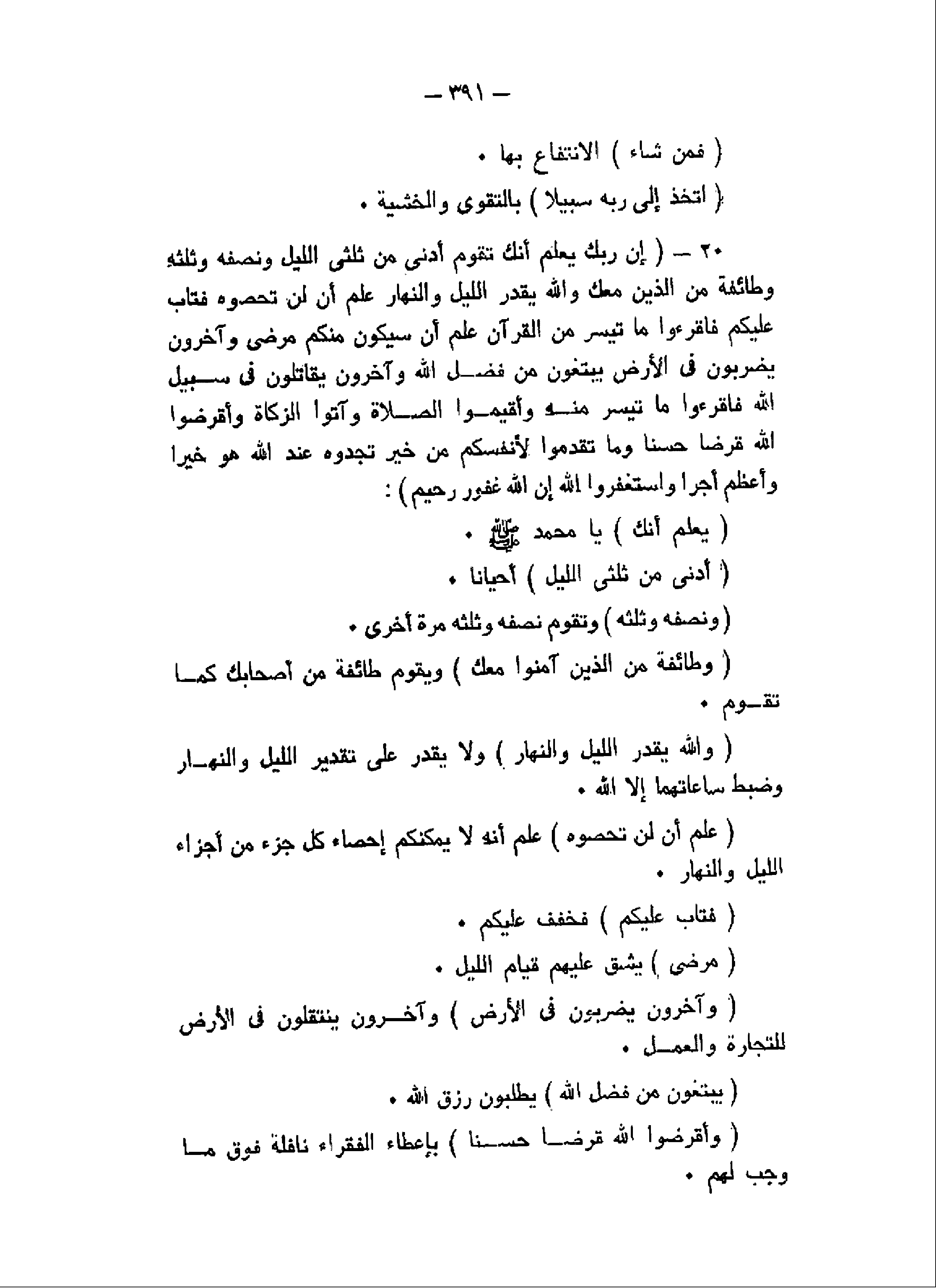 20- إِنَّ رَبَّكَ يَعْلَمُ أَنَّكَ تَقُومُ أَدْنى مِنْ ثُلُثَيِ اللَّيْلِ وَنِصْفَهُ وَثُلُثَهُ وَطائِفَةٌ مِنَ الَّذِينَ مَعَكَ وَاللَّهُ يُقَدِّرُ اللَّيْلَ وَالنَّهارَ عَلِمَ أَنْ لَنْ تُحْصُوهُ فَتابَ عَلَيْكُمْ فَاقْرَؤُا ما تَيَسَّرَ مِنَ الْقُرْآنِ عَلِمَ أَنْ سَيَكُونُ مِنْكُمْ مَرْضى وَآخَرُونَ يَضْرِبُونَ فِي الْأَرْضِ يَبْتَغُونَ مِنْ فَضْلِ اللَّهِ وَآخَرُونَ يُقاتِلُونَ فِي سَبِيلِ اللَّهِ فَاقْرَؤُا ما تَيَسَّرَ مِنْهُ وَأَقِيمُوا الصَّلاةَ وَآتُوا الزَّكاةَ وَأَقْرِضُوا اللَّهَ قَرْضاً حَسَناً وَما تُقَدِّمُوا لِأَنْفُسِكُمْ مِنْ خَيْرٍ تَجِدُوهُ عِنْدَ اللَّهِ هُوَ خَيْراً وَأَعْظَمَ أَجْراً وَاسْتَغْفِرُوا اللَّهَ إِنَّ اللَّهَ غَفُورٌ رَحِيمٌ: