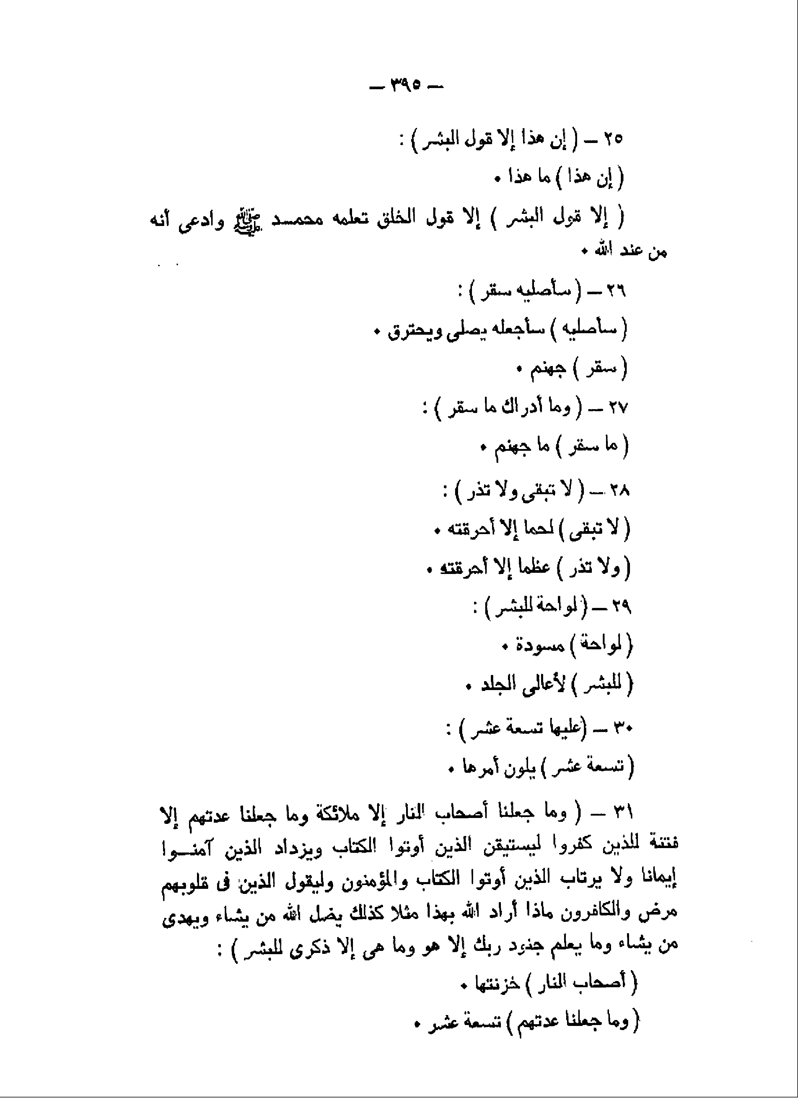 عَلَيْها تِسْعَةَ عَشَرَ (30) وَما جَعَلْنا أَصْحابَ النَّارِ إِلاَّ مَلائِكَةً وَما جَعَلْنا عِدَّتَهُمْ إِلاَّ فِتْنَةً لِلَّذِينَ كَفَرُوا لِيَسْتَيْقِنَ الَّذِينَ أُوتُوا الْكِتابَ وَيَزْدادَ الَّذِينَ آمَنُوا إِيماناً وَلا يَرْتابَ الَّذِينَ أُوتُوا الْكِتابَ وَالْمُؤْمِنُونَ وَلِيَقُولَ الَّذِينَ فِي قُلُوبِهِمْ مَرَضٌ وَالْكافِرُونَ ماذا أَرادَ اللَّهُ بِهذا مَثَلاً كَذلِكَ يُضِلُّ اللَّهُ مَنْ يَشاءُ وَيَهْدِي مَنْ يَشاءُ وَما يَعْلَمُ جُنُودَ رَبِّكَ إِلاَّ هُوَ وَما هِيَ إِلاَّ ذِكْرى لِلْبَشَرِ (31)