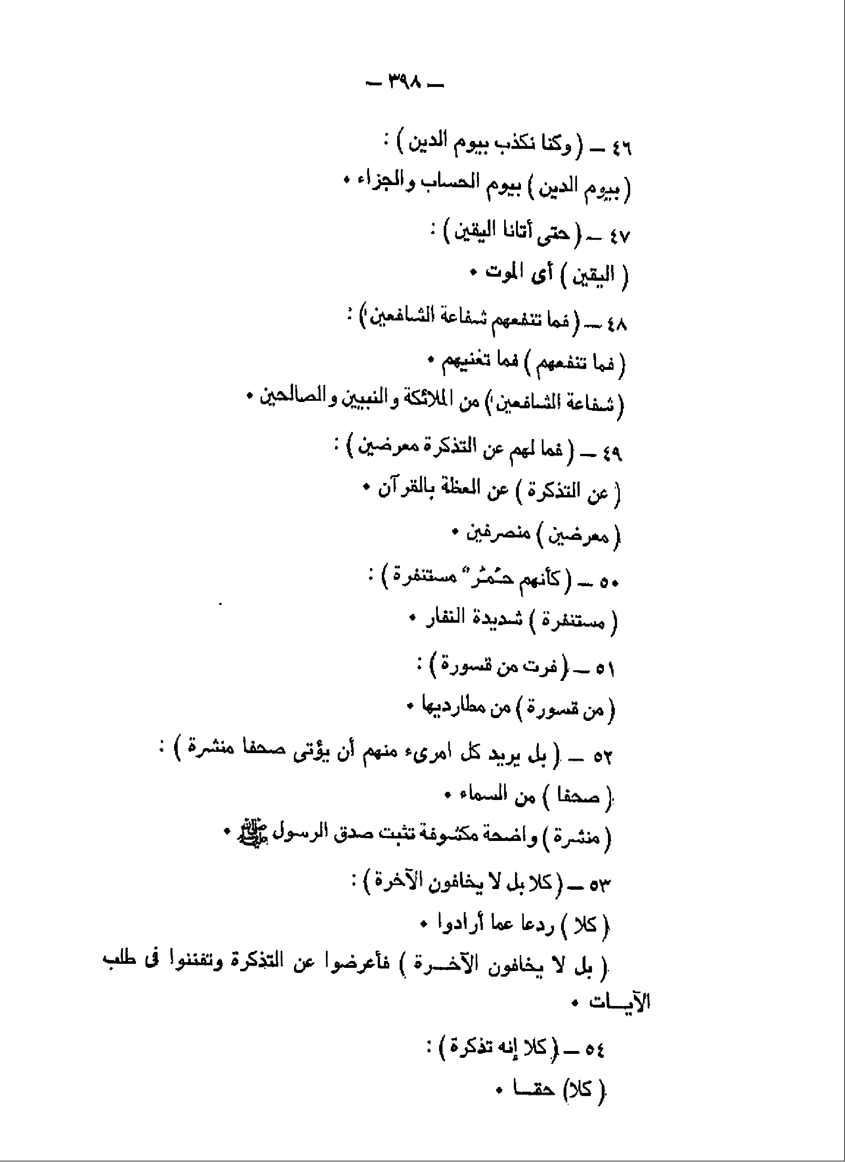 وَكُنَّا نُكَذِّبُ بِيَوْمِ الدِّينِ (46) حَتَّى أَتانَا الْيَقِينُ (47) فَما تَنْفَعُهُمْ شَفاعَةُ الشَّافِعِينَ (48) فَما لَهُمْ عَنِ التَّذْكِرَةِ مُعْرِضِينَ (49) كَأَنَّهُمْ حُمُرٌ مُسْتَنْفِرَةٌ (50)