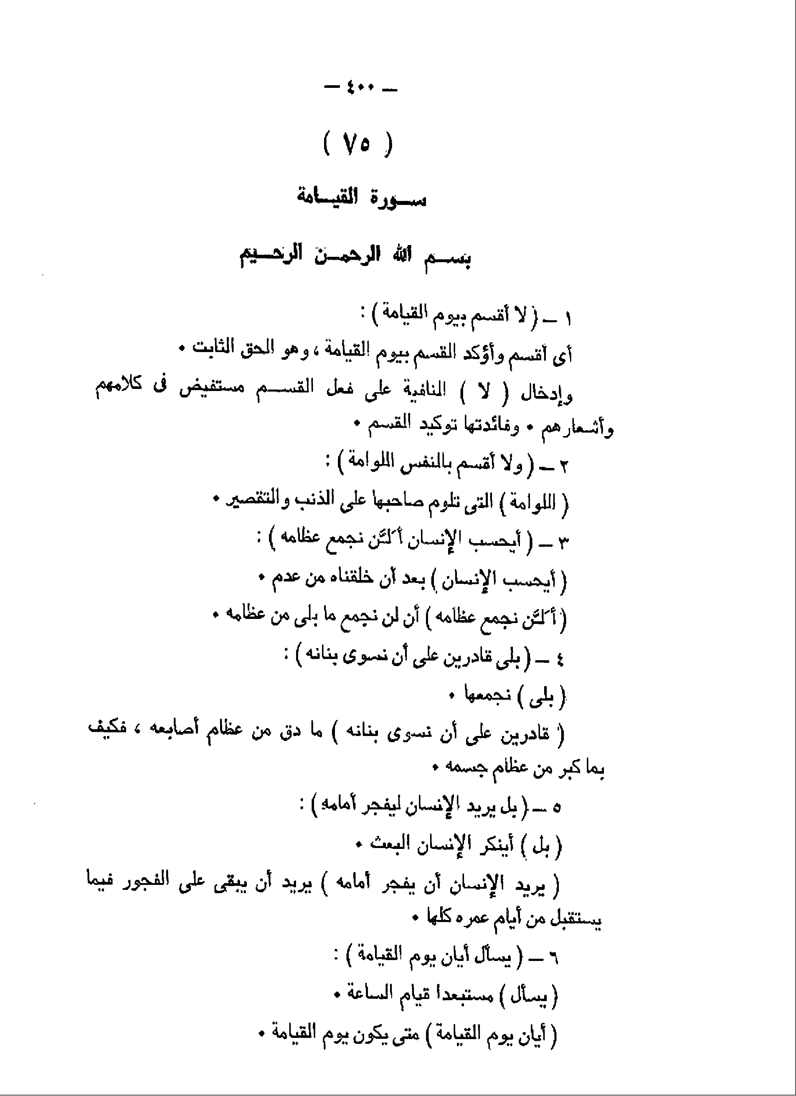 لا أُقْسِمُ بِيَوْمِ الْقِيامَةِ (1) وَلا أُقْسِمُ بِالنَّفْسِ اللَّوَّامَةِ (2) أَيَحْسَبُ الْإِنْسانُ أَلَّنْ نَجْمَعَ عِظامَهُ (3) بَلى قادِرِينَ عَلى أَنْ نُسَوِّيَ بَنانَهُ (4)