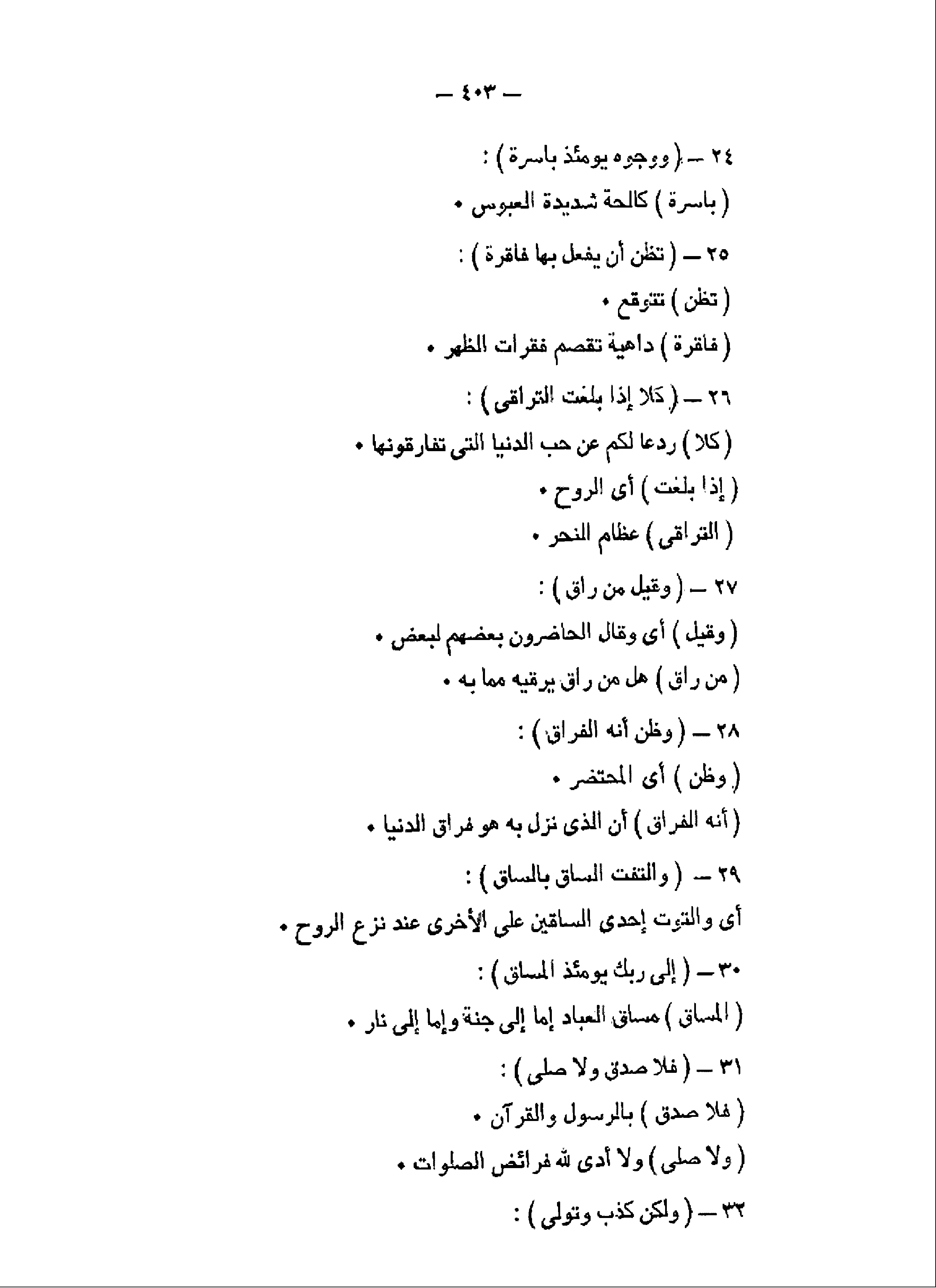 وَوُجُوهٌ يَوْمَئِذٍ باسِرَةٌ (24) تَظُنُّ أَنْ يُفْعَلَ بِها فاقِرَةٌ (25) كَلاَّ إِذا بَلَغَتِ التَّراقِيَ (26) وَقِيلَ مَنْ راقٍ (27) وَظَنَّ أَنَّهُ الْفِراقُ (28)