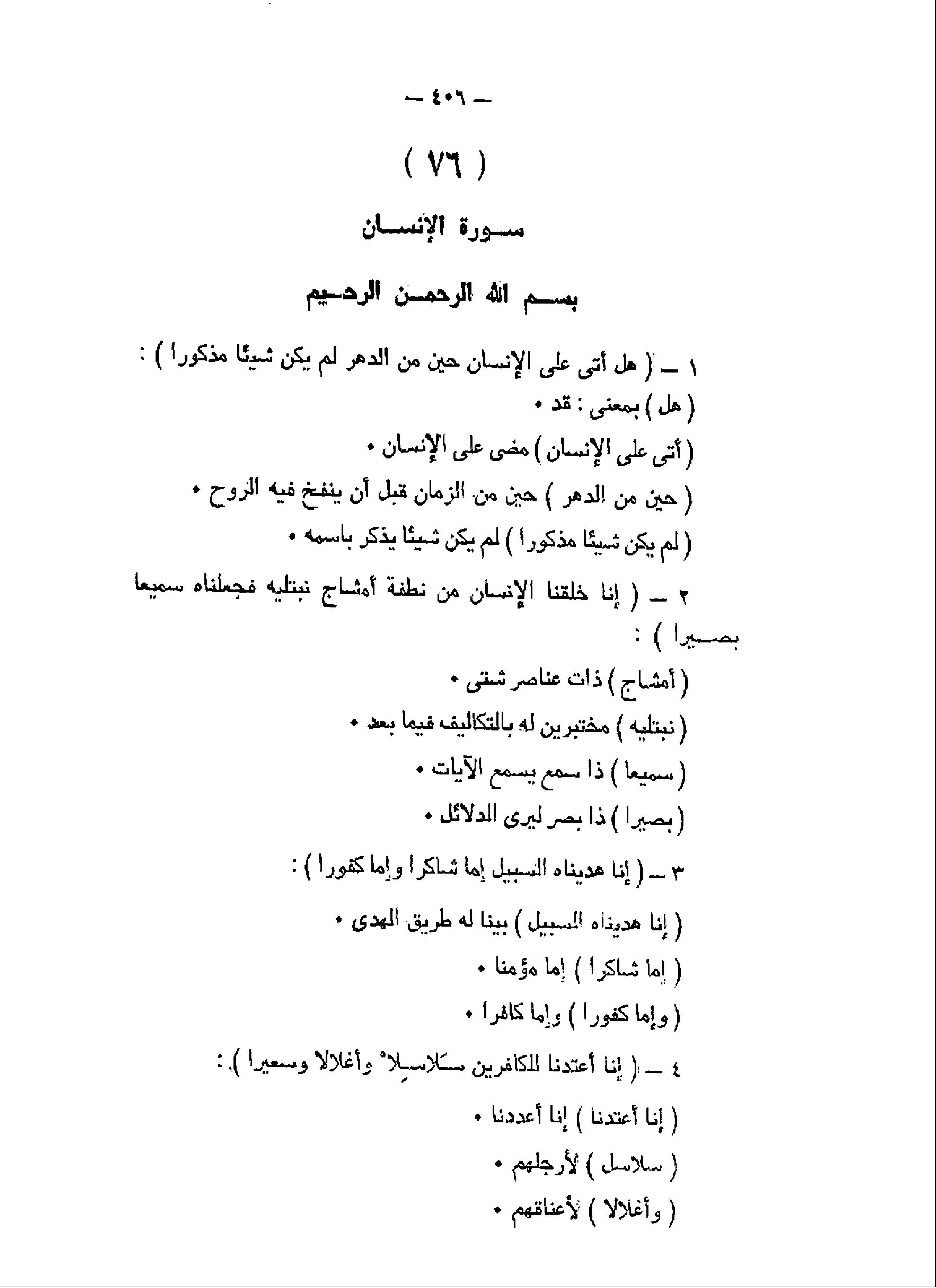 هَلْ أَتى عَلَى الْإِنْسانِ حِينٌ مِنَ الدَّهْرِ لَمْ يَكُنْ شَيْئاً مَذْكُوراً (1) إِنَّا خَلَقْنَا الْإِنْسانَ مِنْ نُطْفَةٍ أَمْشاجٍ نَبْتَلِيهِ فَجَعَلْناهُ سَمِيعاً بَصِيراً (2) إِنَّا هَدَيْناهُ السَّبِيلَ إِمَّا شاكِراً وَإِمَّا كَفُوراً (3) إِنَّا أَعْتَدْنا لِلْكافِرِينَ سَلاسِلَ وَأَغْلالاً وَسَعِيراً (4)