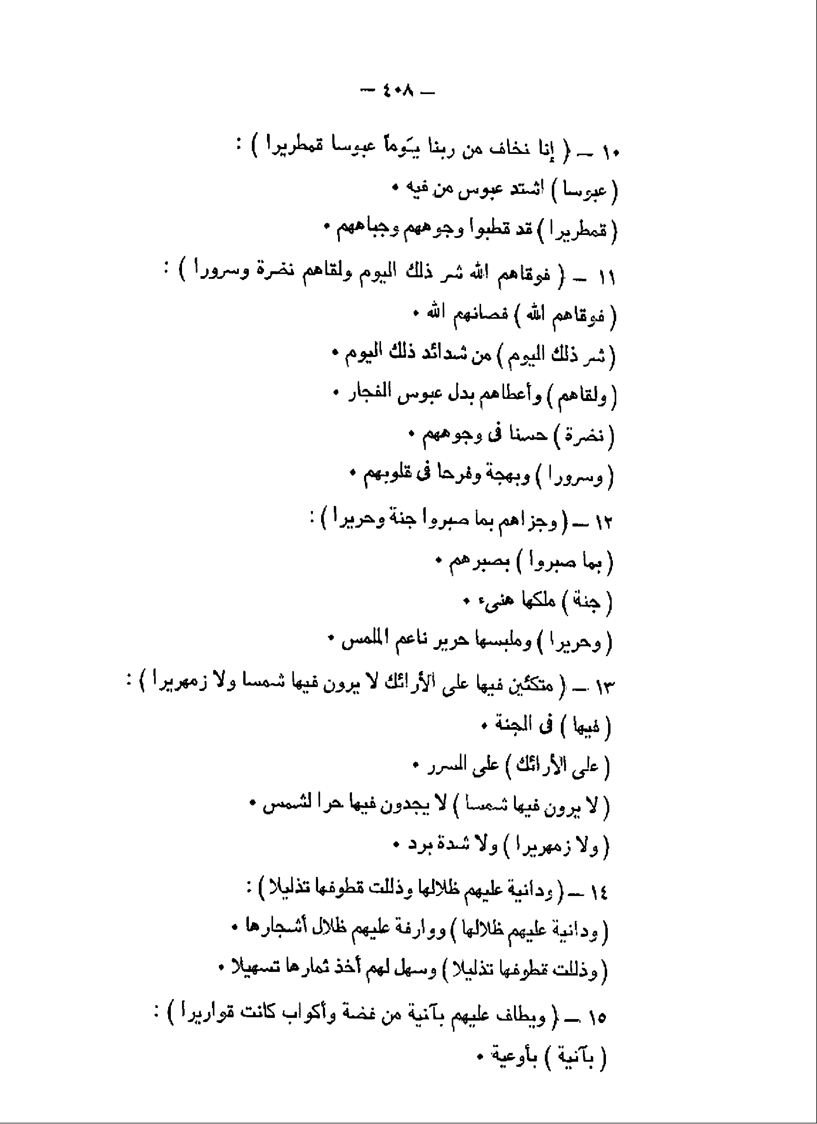 إِنَّا نَخافُ مِنْ رَبِّنا يَوْماً عَبُوساً قَمْطَرِيراً (10) فَوَقاهُمُ اللَّهُ شَرَّ ذلِكَ الْيَوْمِ وَلَقَّاهُمْ نَضْرَةً وَسُرُوراً (11) وَجَزاهُمْ بِما صَبَرُوا جَنَّةً وَحَرِيراً (12) مُتَّكِئِينَ فِيها عَلَى الْأَرائِكِ لا يَرَوْنَ فِيها شَمْساً وَلا زَمْهَرِيراً (13) وَدانِيَةً عَلَيْهِمْ ظِلالُها وَذُلِّلَتْ قُطُوفُها تَذْلِيلاً (14)