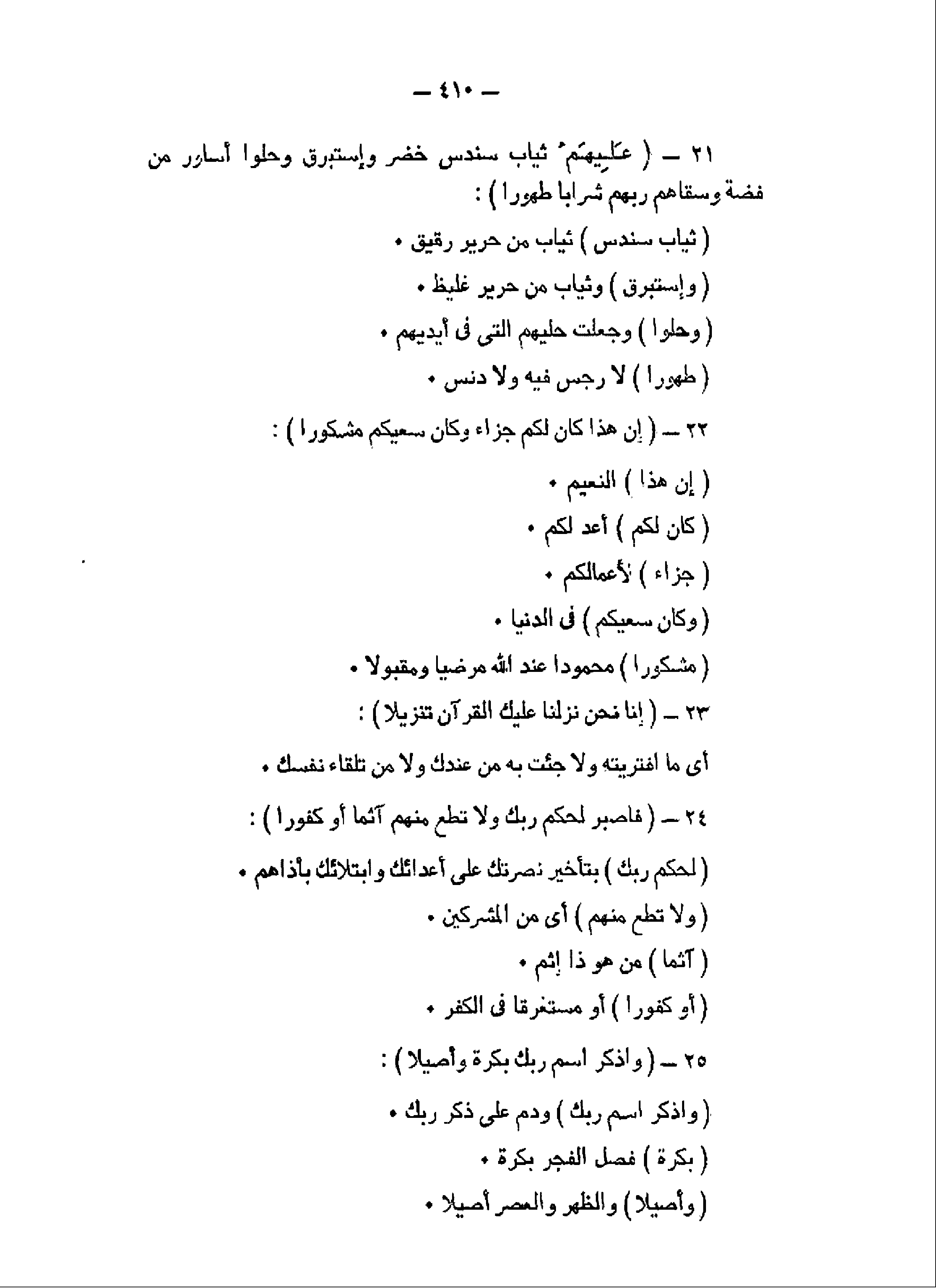 عالِيَهُمْ ثِيابُ سُندُسٍ خُضْرٌ وَإِسْتَبْرَقٌ وَحُلُّوا أَساوِرَ مِنْ فِضَّةٍ وَسَقاهُمْ رَبُّهُمْ شَراباً طَهُوراً (21) إِنَّ هذا كانَ لَكُمْ جَزاءً وَكانَ سَعْيُكُمْ مَشْكُوراً (22) إِنَّا نَحْنُ نَزَّلْنا عَلَيْكَ الْقُرْآنَ تَنْزِيلاً (23) فَاصْبِرْ لِحُكْمِ رَبِّكَ وَلا تُطِعْ مِنْهُمْ آثِماً أَوْ كَفُوراً (24) وَاذْكُرِ اسْمَ رَبِّكَ بُكْرَةً وَأَصِيلاً (25)