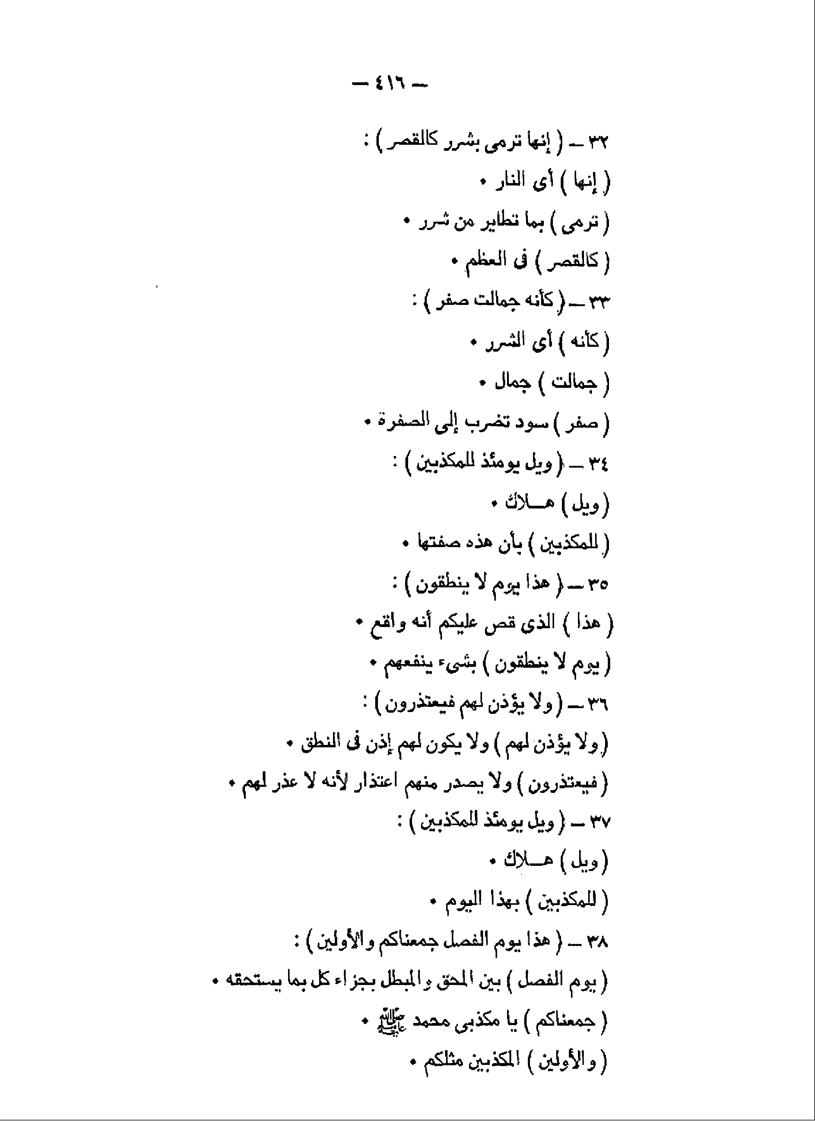 إِنَّها تَرْمِي بِشَرَرٍ كَالْقَصْرِ (32) كَأَنَّهُ جِمالَتٌ صُفْرٌ (33) وَيْلٌ يَوْمَئِذٍ لِلْمُكَذِّبِينَ (34) هذا يَوْمُ لا يَنْطِقُونَ (35) وَلا يُؤْذَنُ لَهُمْ فَيَعْتَذِرُونَ (36)
