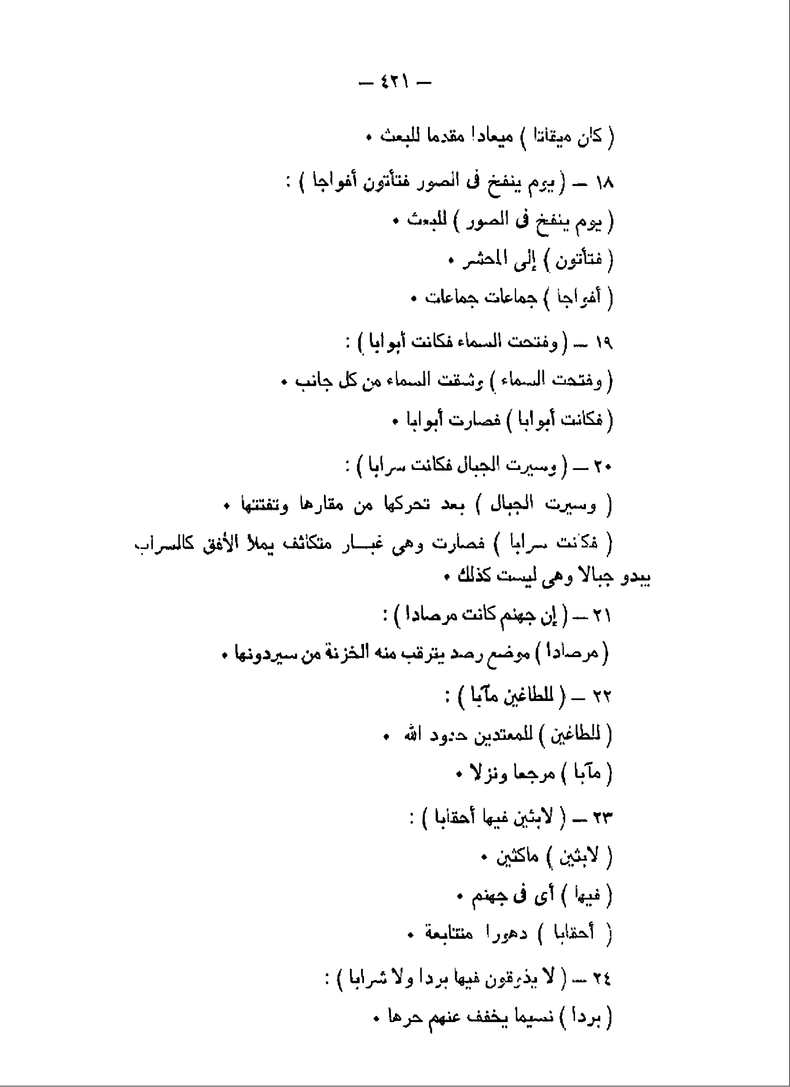 يَوْمَ يُنْفَخُ فِي الصُّورِ فَتَأْتُونَ أَفْواجاً (18) وَفُتِحَتِ السَّماءُ فَكانَتْ أَبْواباً (19) وَسُيِّرَتِ الْجِبالُ فَكانَتْ سَراباً (20) إِنَّ جَهَنَّمَ كانَتْ مِرْصاداً (21) لِلطَّاغِينَ مَآباً (22)