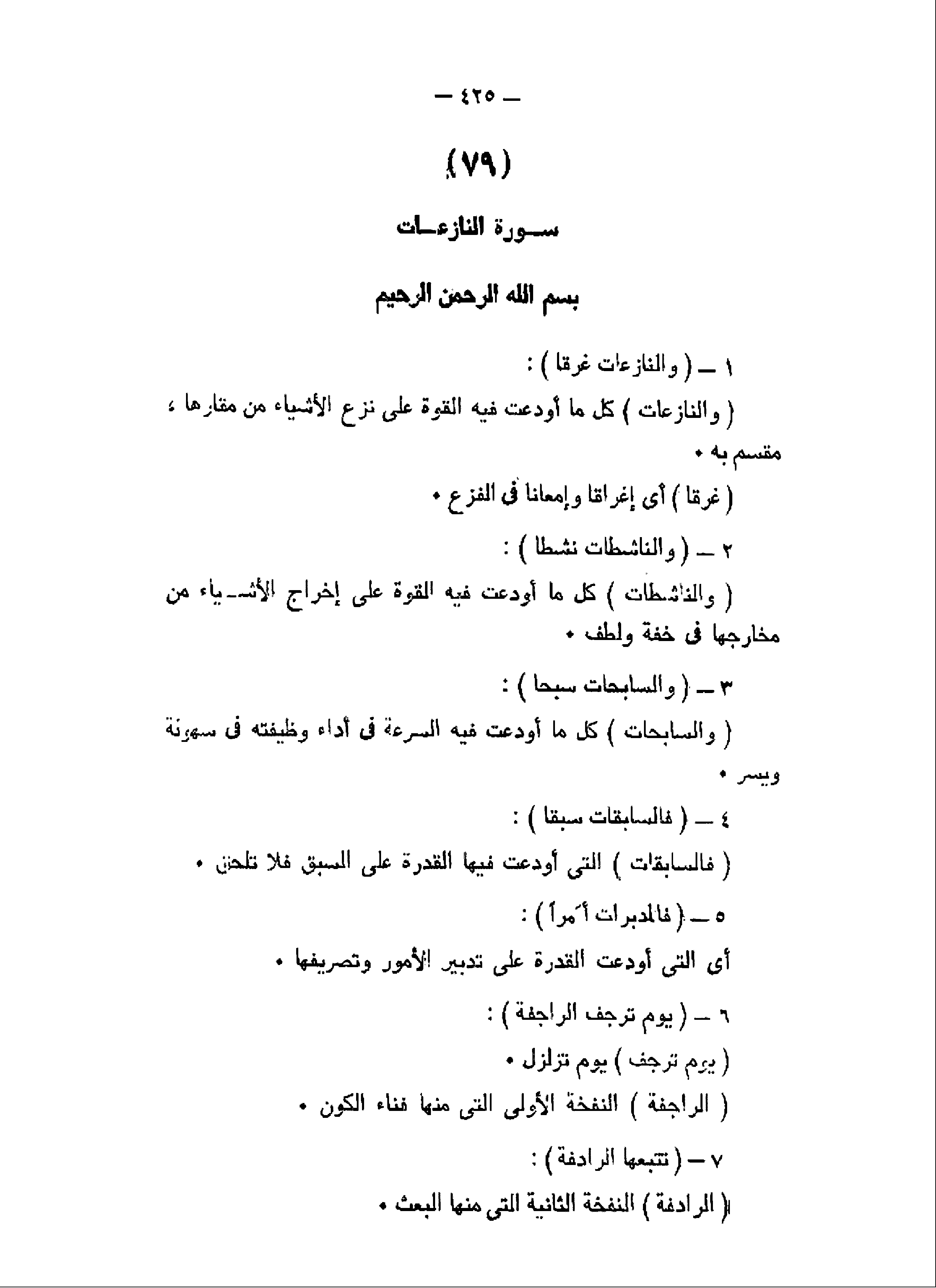 وَالنَّازِعاتِ غَرْقاً (1) وَالنَّاشِطاتِ نَشْطاً (2) وَالسَّابِحاتِ سَبْحاً (3) فَالسَّابِقاتِ سَبْقاً (4)