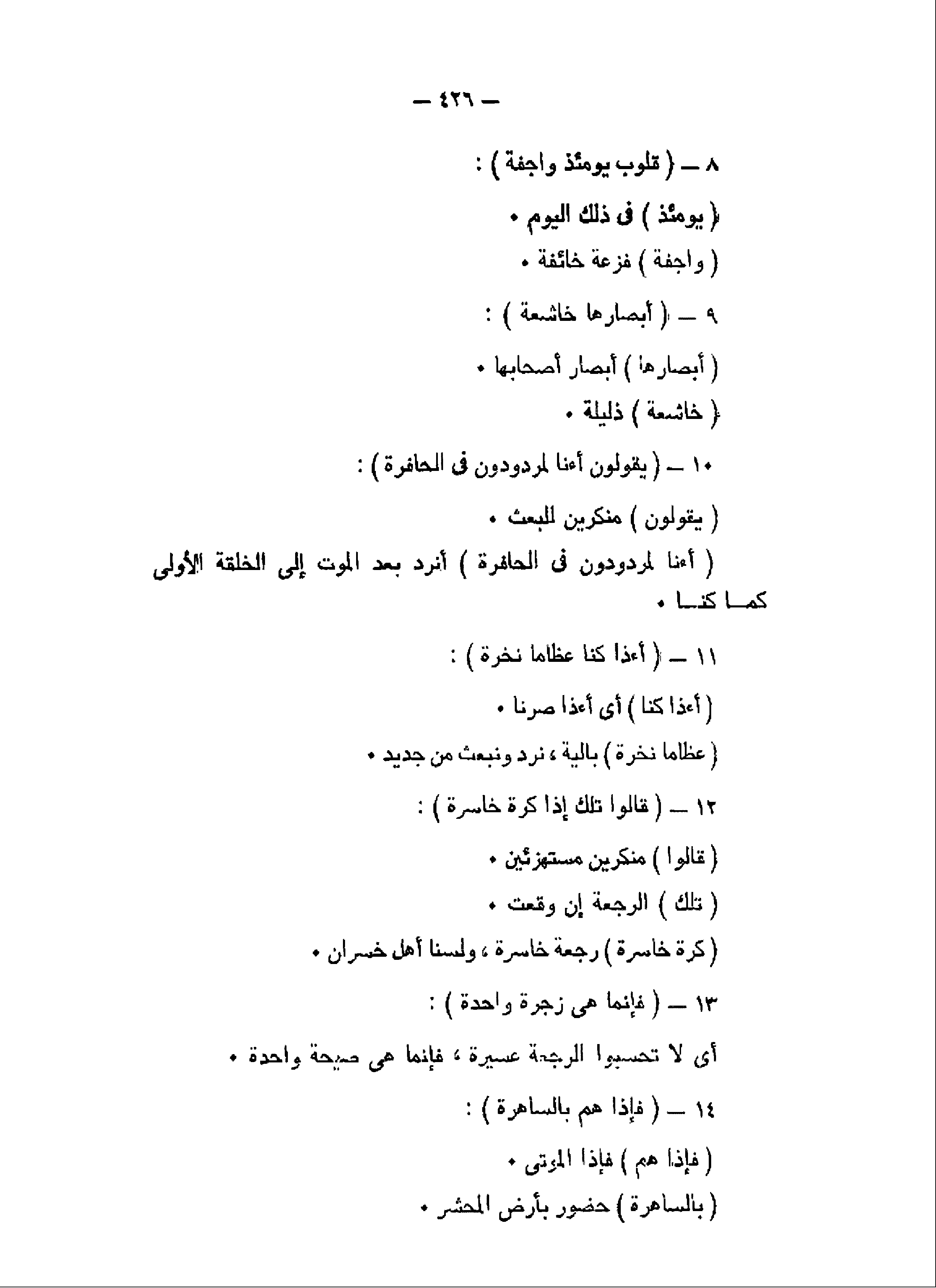 يَقُولُونَ أَإِنَّا لَمَرْدُودُونَ فِي الْحافِرَةِ (10) أَإِذا كُنَّا عِظاماً نَخِرَةً (11) قالُوا تِلْكَ إِذاً كَرَّةٌ خاسِرَةٌ (12) فَإِنَّما هِيَ زَجْرَةٌ واحِدَةٌ (13) فَإِذا هُمْ بِالسَّاهِرَةِ (14)