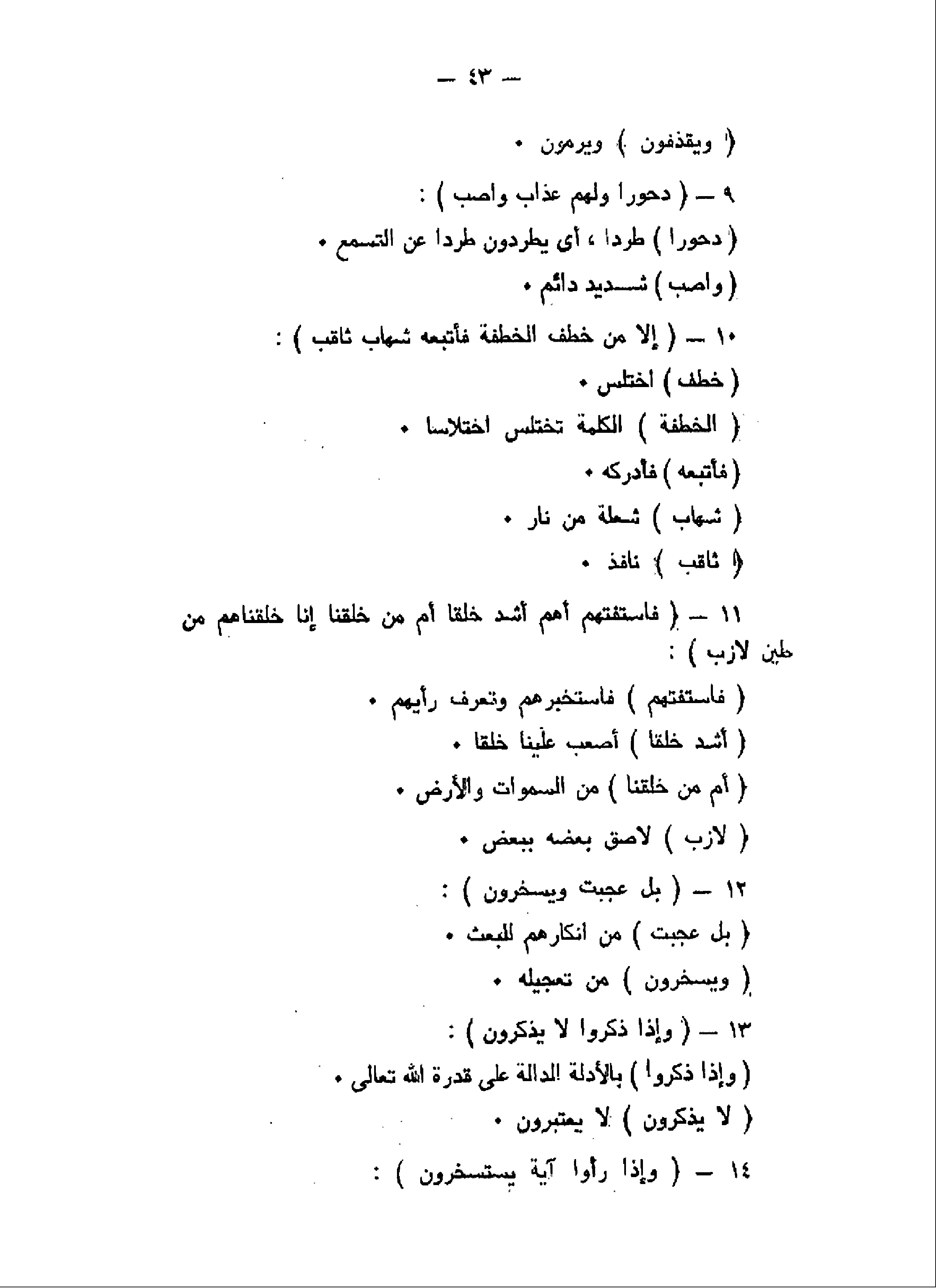إِلاَّ مَنْ خَطِفَ الْخَطْفَةَ فَأَتْبَعَهُ شِهابٌ ثاقِبٌ (10) فَاسْتَفْتِهِمْ أَهُمْ أَشَدُّ خَلْقاً أَمْ مَنْ خَلَقْنا إِنَّا خَلَقْناهُمْ مِنْ طِينٍ لازِبٍ (11) بَلْ عَجِبْتَ وَيَسْخَرُونَ (12) وَإِذا ذُكِّرُوا لا يَذْكُرُونَ (13) وَإِذا رَأَوْا آيَةً يَسْتَسْخِرُونَ (14)