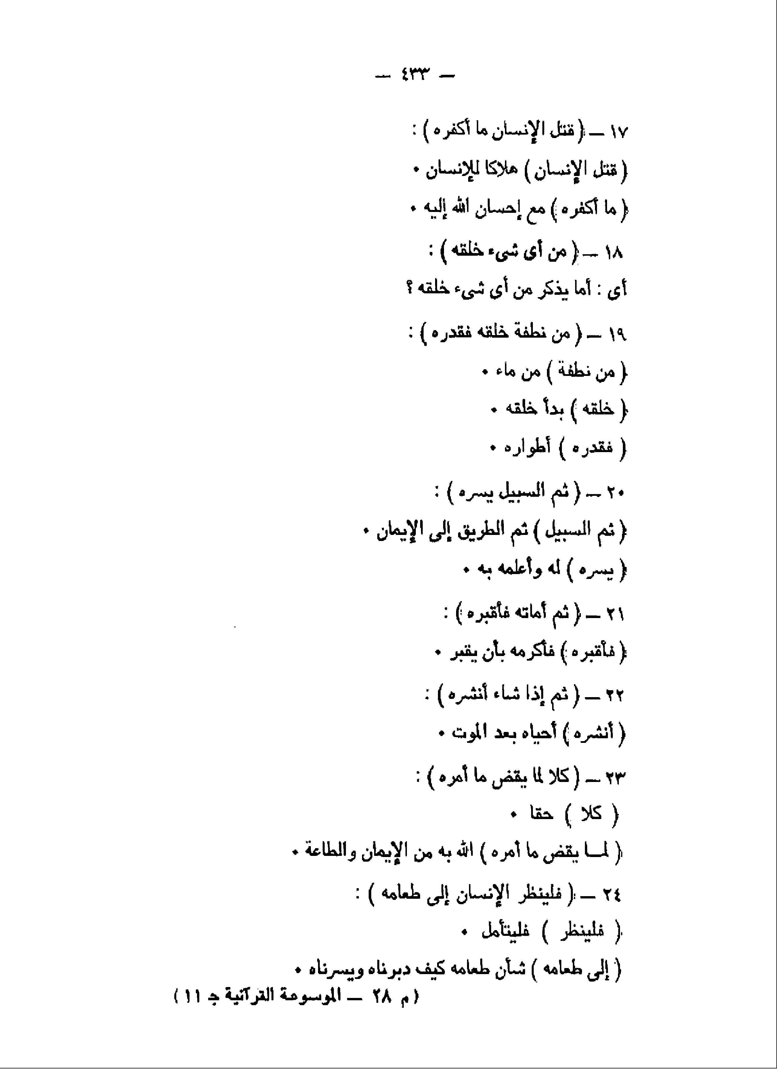قُتِلَ الْإِنْسانُ ما أَكْفَرَهُ (17) مِنْ أَيِّ شَيْءٍ خَلَقَهُ (18) مِنْ نُطْفَةٍ خَلَقَهُ فَقَدَّرَهُ (19) ثُمَّ السَّبِيلَ يَسَّرَهُ (20) ثُمَّ أَماتَهُ فَأَقْبَرَهُ (21)