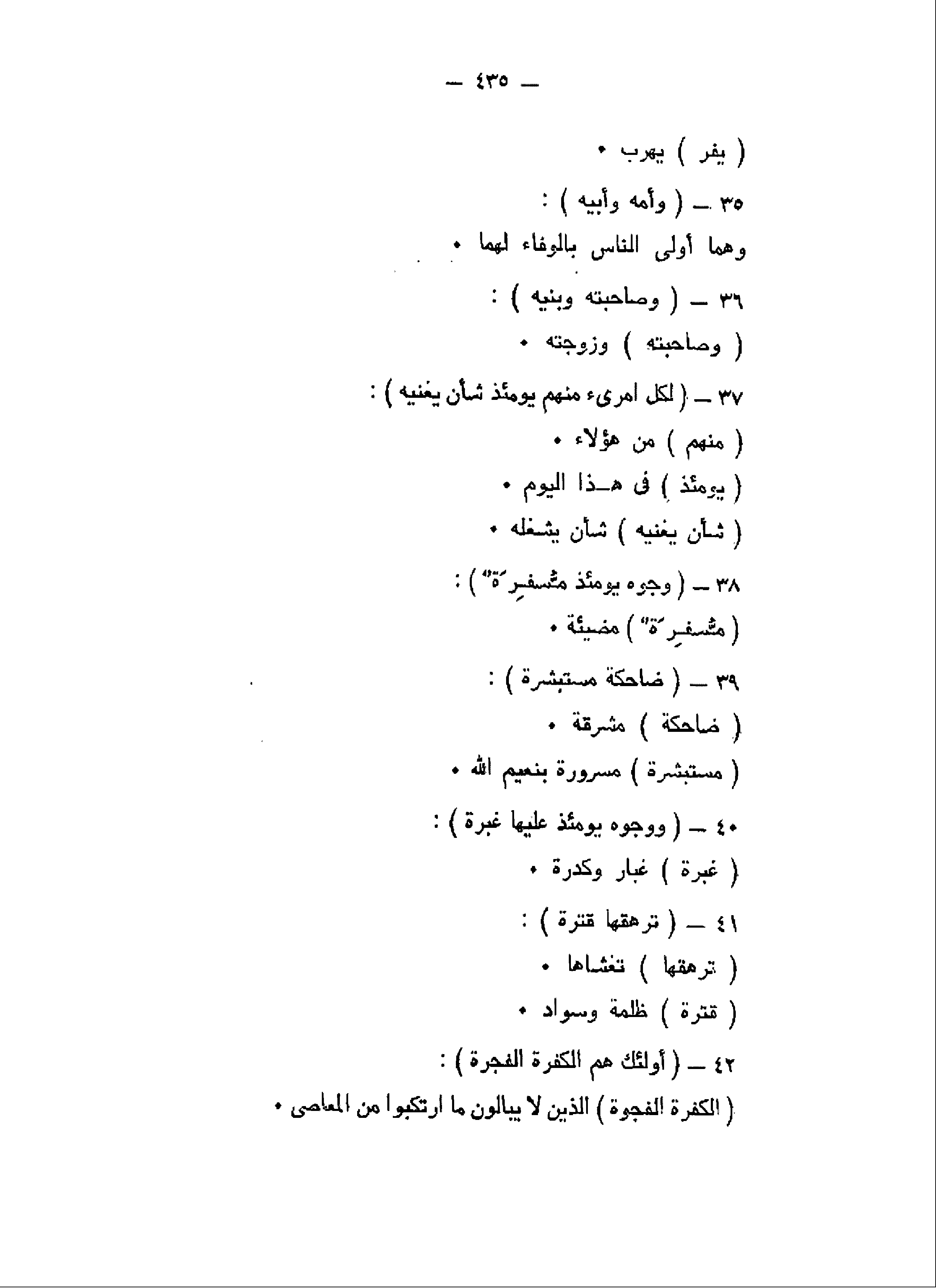 وَأُمِّهِ وَأَبِيهِ (35) وَصاحِبَتِهِ وَبَنِيهِ (36) لِكُلِّ امْرِئٍ مِنْهُمْ يَوْمَئِذٍ شَأْنٌ يُغْنِيهِ (37) وُجُوهٌ يَوْمَئِذٍ مُسْفِرَةٌ (38) ضاحِكَةٌ مُسْتَبْشِرَةٌ (39)