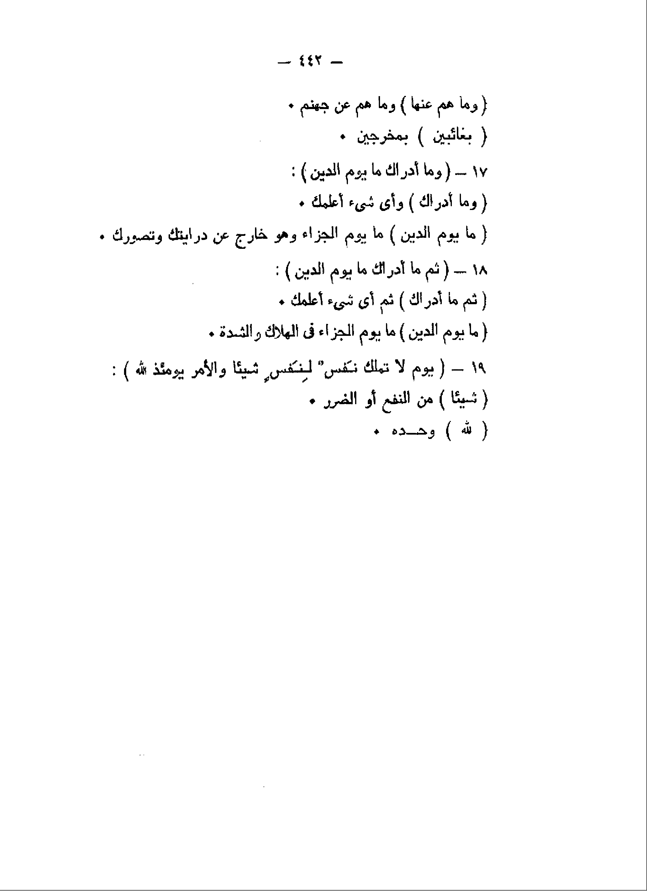 وَما أَدْراكَ ما يَوْمُ الدِّينِ (17) ثُمَّ ما أَدْراكَ ما يَوْمُ الدِّينِ (18) يَوْمَ لا تَمْلِكُ نَفْسٌ لِنَفْسٍ شَيْئاً وَالْأَمْرُ يَوْمَئِذٍ لِلَّهِ (19)