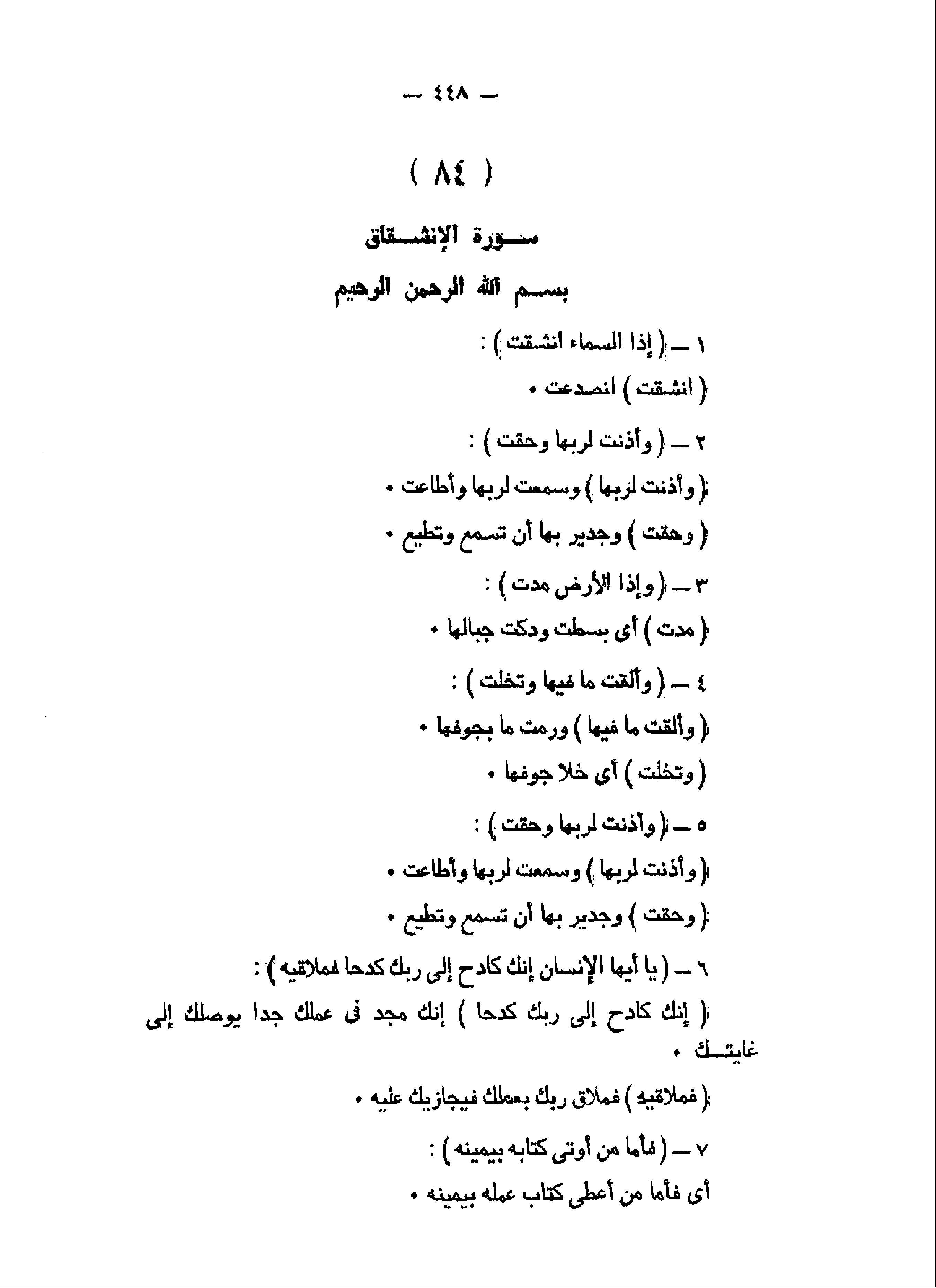 إِذَا السَّماءُ انْشَقَّتْ (1) وَأَذِنَتْ لِرَبِّها وَحُقَّتْ (2) وَإِذَا الْأَرْضُ مُدَّتْ (3) وَأَلْقَتْ ما فِيها وَتَخَلَّتْ (4)
